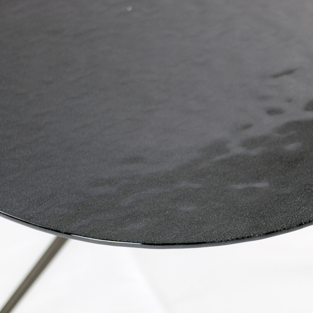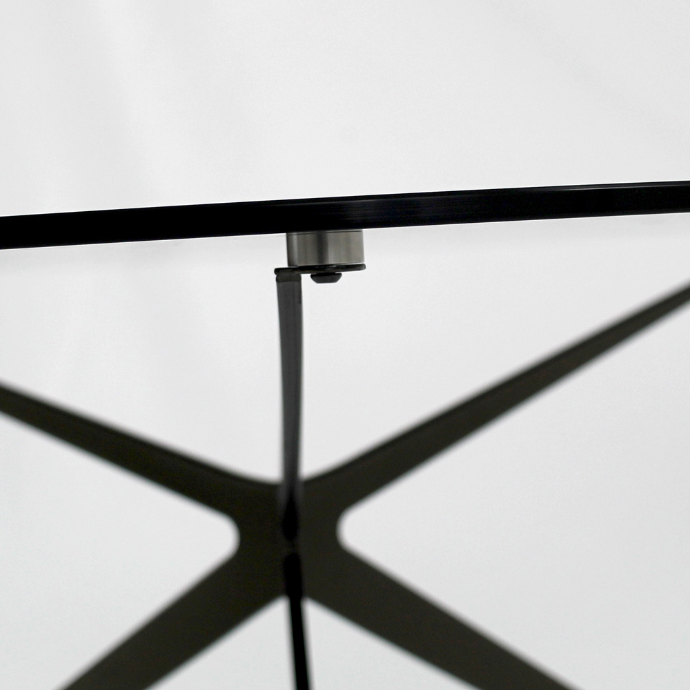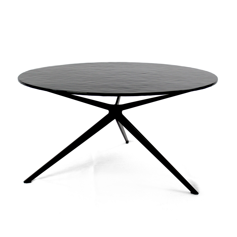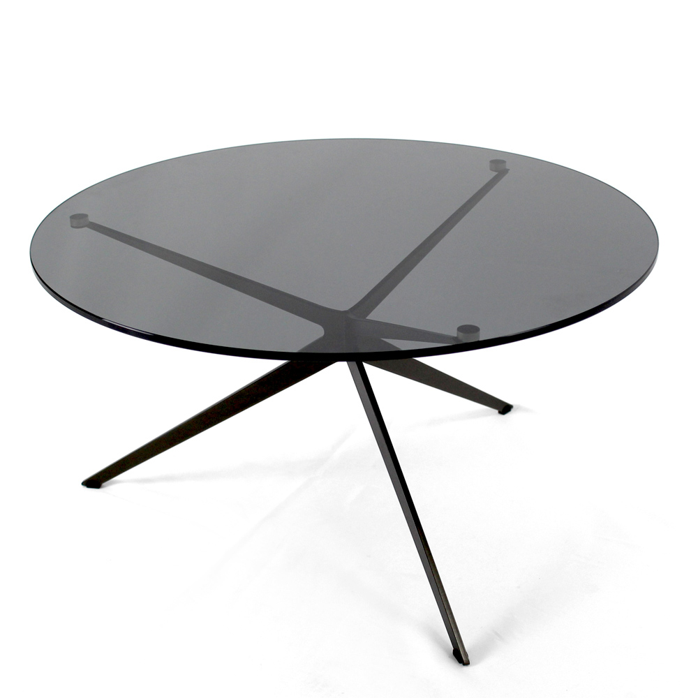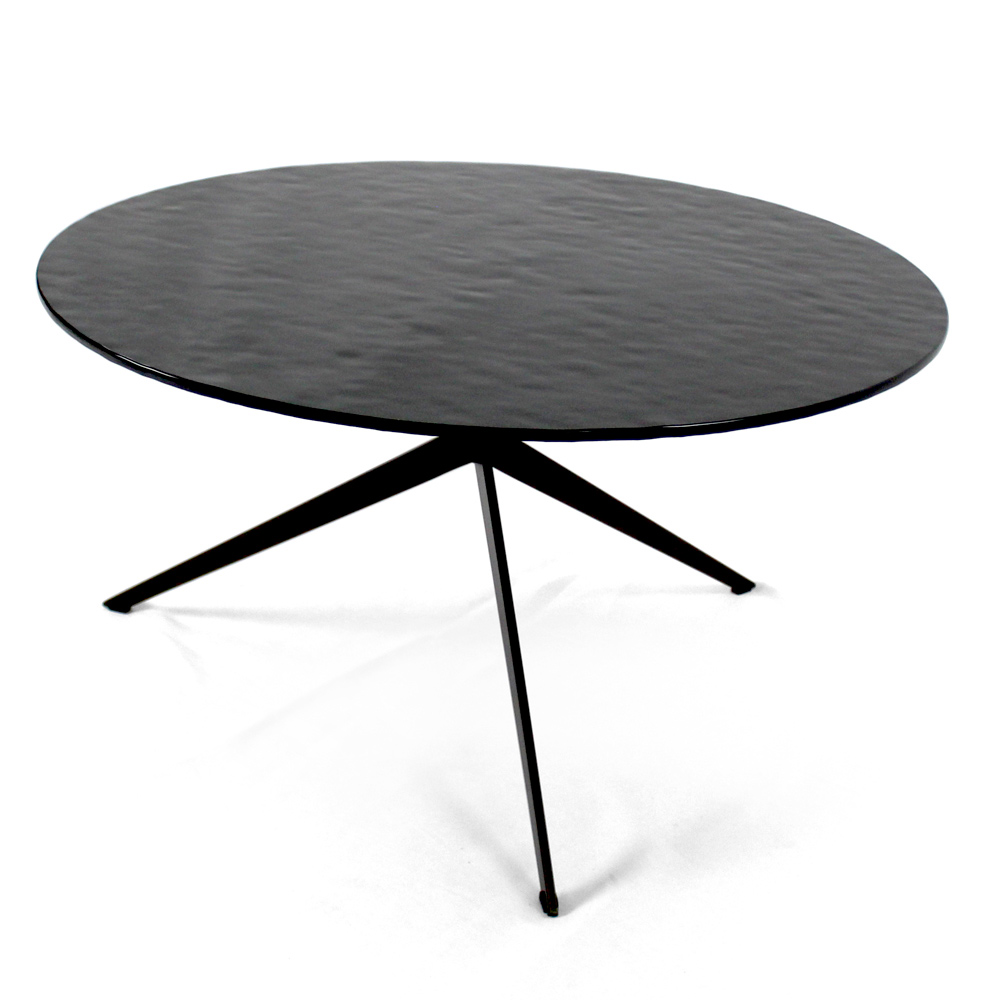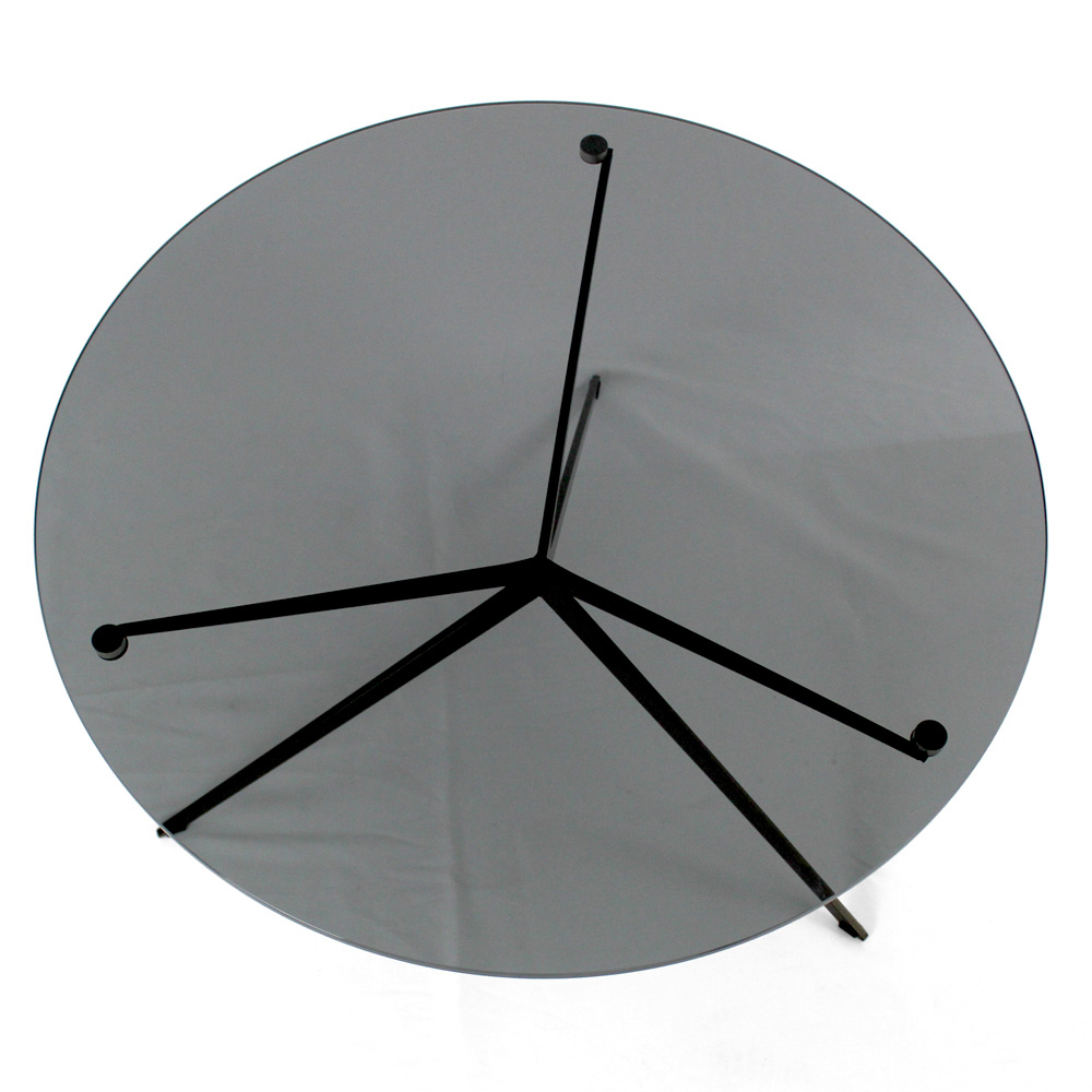 Kulatý konferenční stolek s lakovanou ocelovou základnou a skleněná deska.
