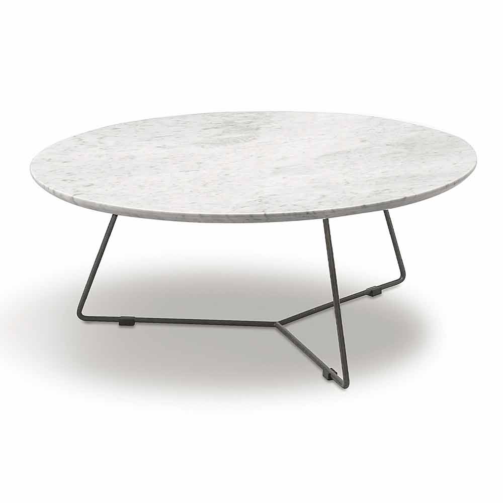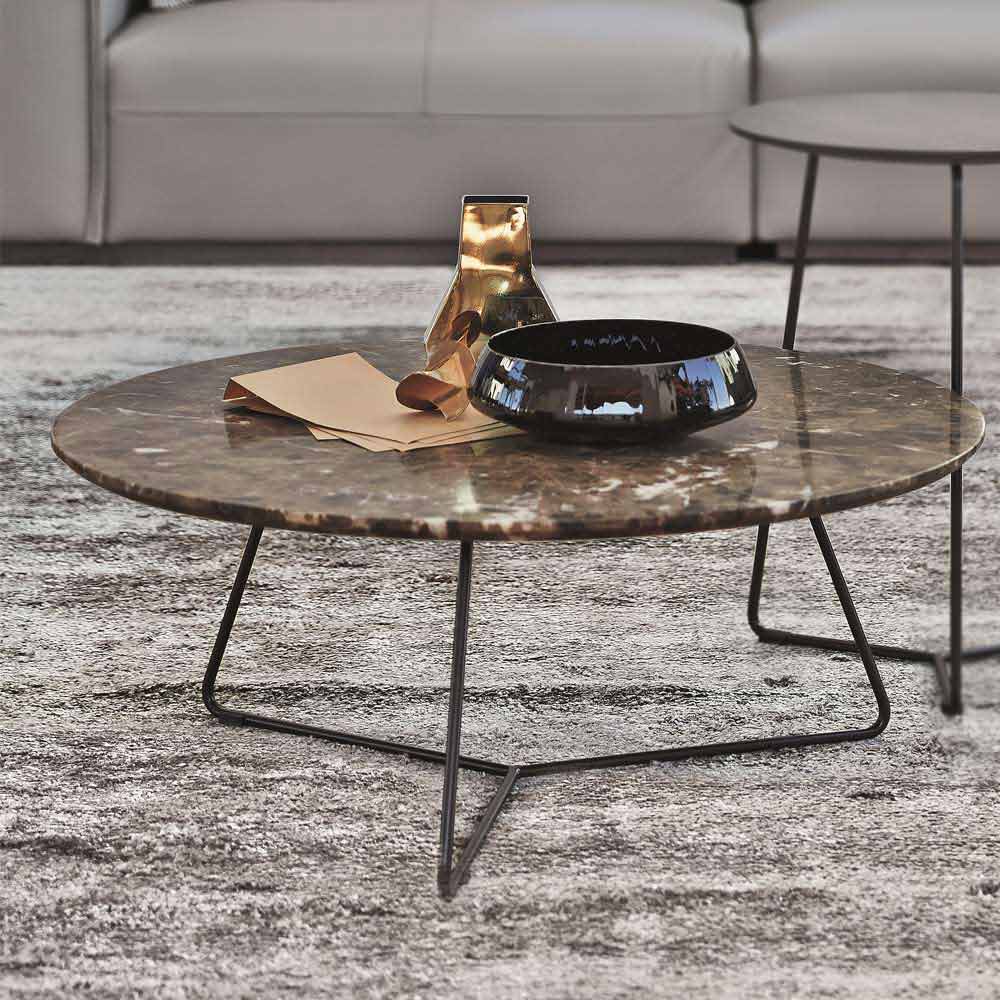 spočívá kulatá mramorová deska. Tento článek, který se vyznačuje mimořádně neformálním designem, se ukazuje jako univerzální a má příčný styl, a proto je snadno kombinovatelný s nejrůznějšími moderními situacemi při vybavení obývacího prostoru. Dokonalá kombinace mezi nadčasovou elegancí mramoru a nespornou kovovou moderností vám umožní vytvořit konferenční stolek, který ztělesňuje funkčnost a design, základní prvky, které vám umožní dotvořit nábytek vašeho obývacího pokoje originálním a avantgardním způsobem.
