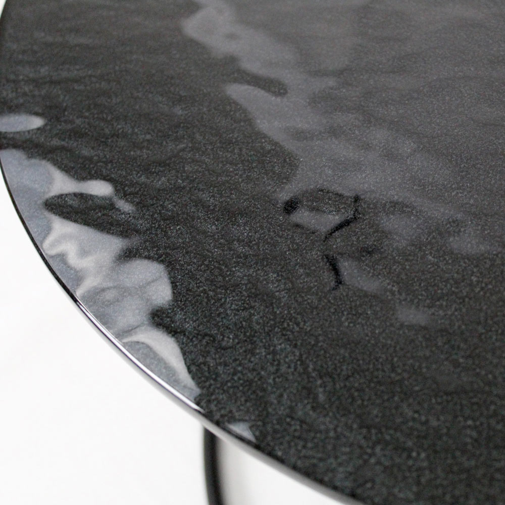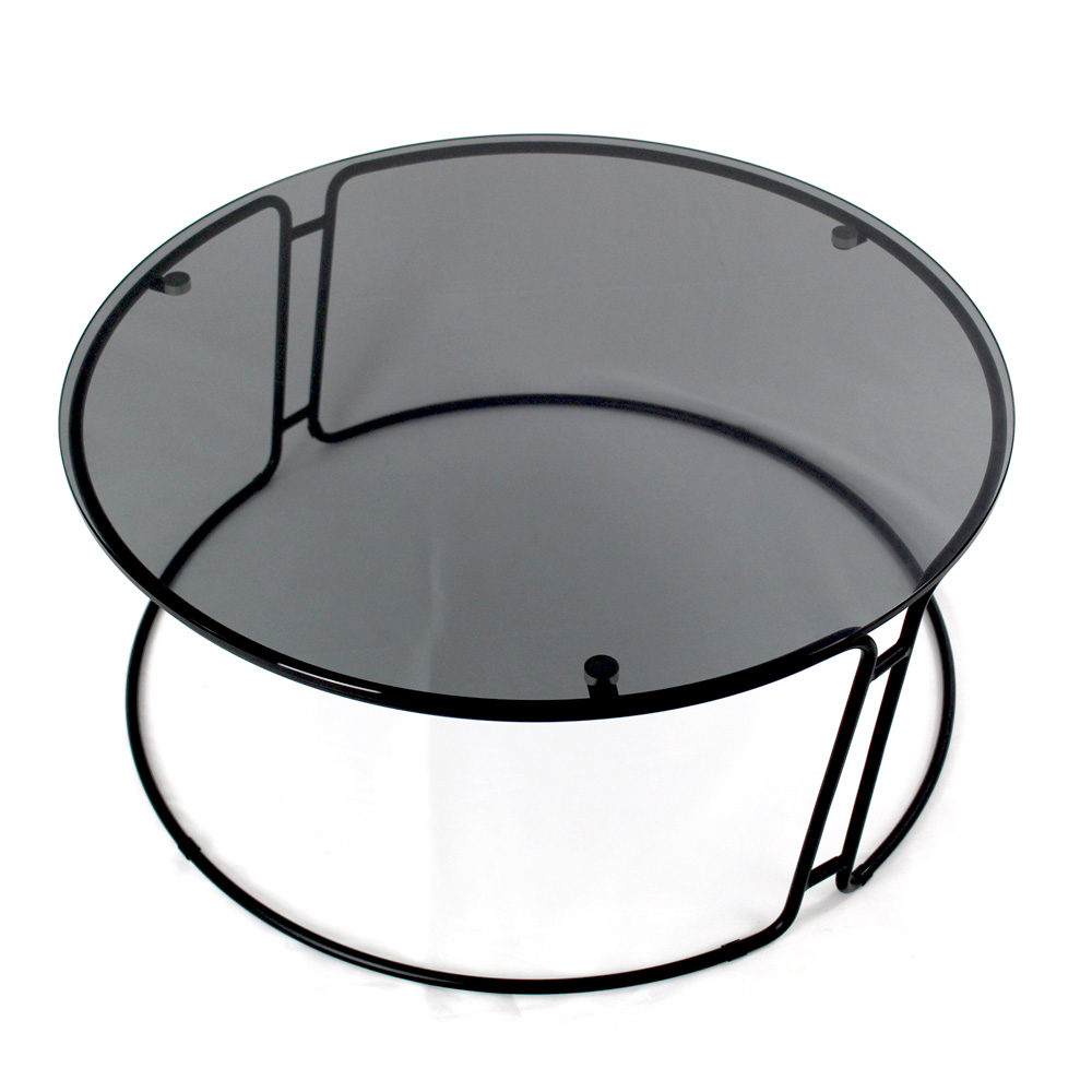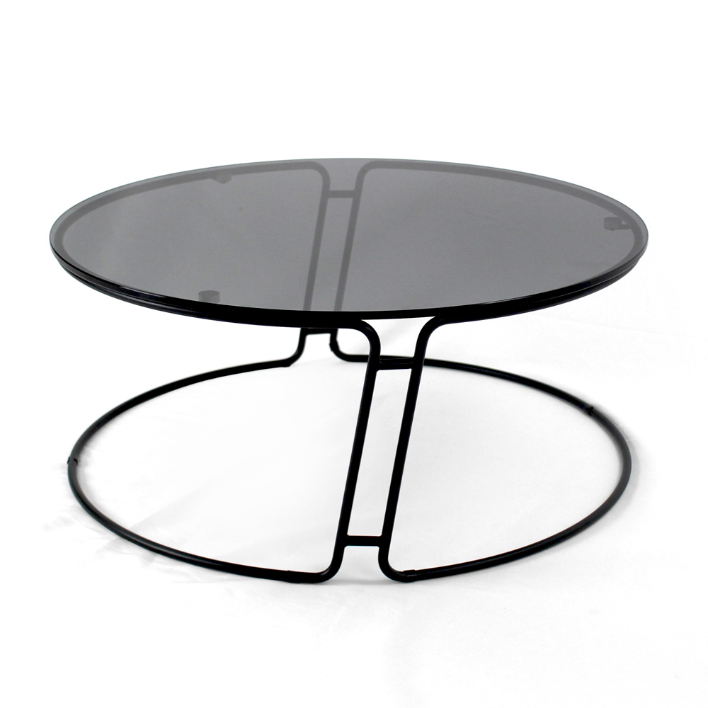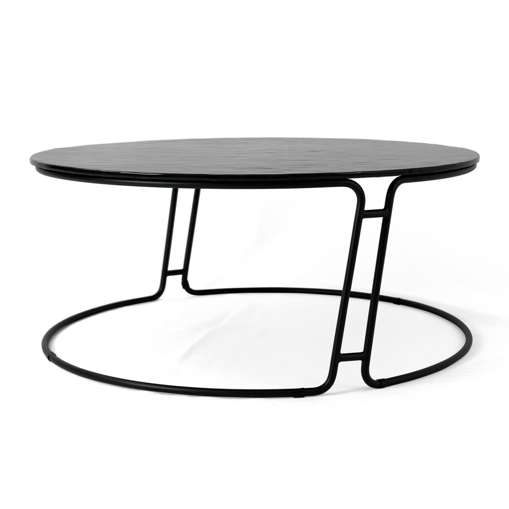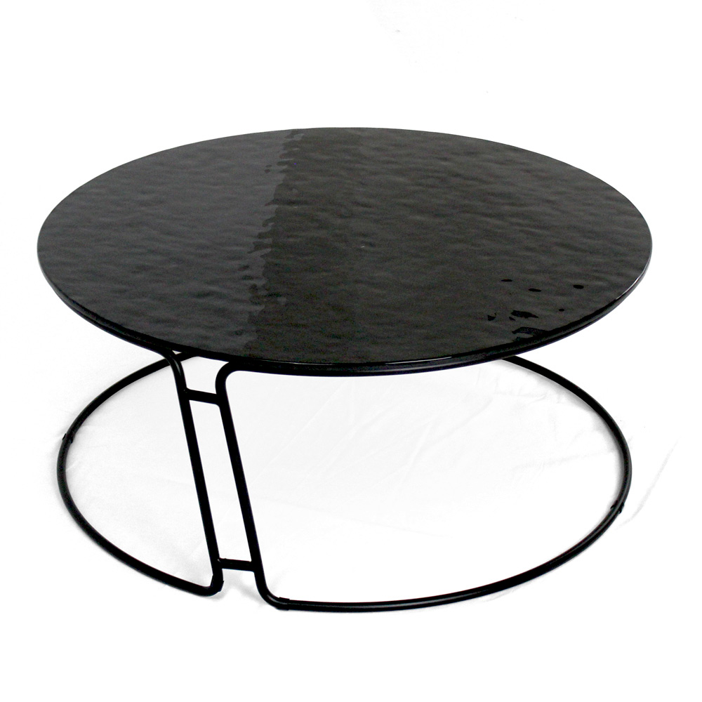 Kulatý konferenční stolek s lakovanou ocelovou základnou a skleněná deska.