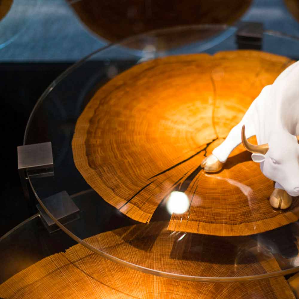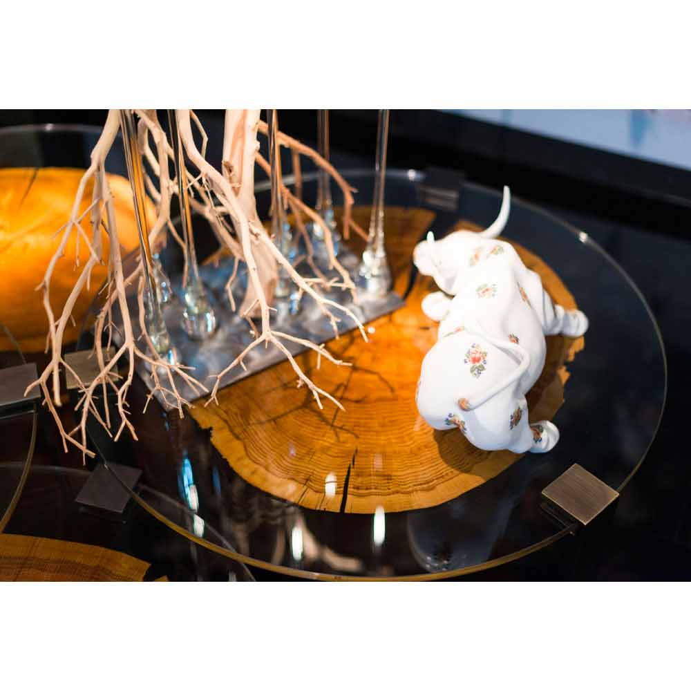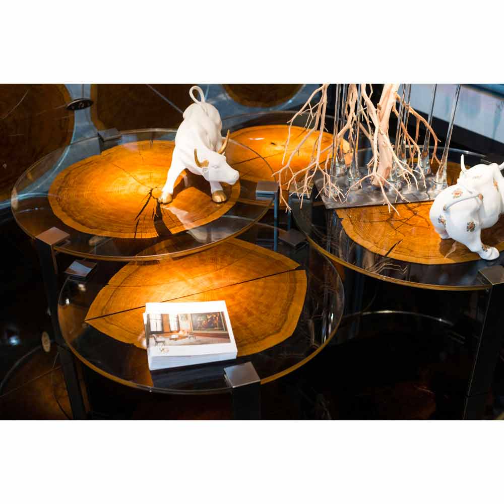 Konferenční stolek vyrobený v Itálii s kulatým vrcholem ze spřaženého skla (5 + 5 mm), uvnitř kterého je vložen tenký díl řezaného dřeva , podporovaný 3 kovovými nohami s leštěnou mosaznou úpravou . Z exkluzivní kombinace vytříbeného doteku skla, nádherných barev dřeva a moderní estetiky kovu se zrodilo jedinečné řešení vybavení, které svou myšlenku zakládá na konceptech inovace a elegance pro avantgardní výsledek se silnou osobností. moderní . Jeho sílu představuje dokonalá kombinace povrchových úprav a materiálů, které zvyšují hodnotu konferenčního stolku, aniž by byl opomenut základní funkční aspekt podtržený 100% provedením Made in Italy a použitím kvalitních surovin, což umožňuje nabídnout bytový doplněk s revoluční krásou a zároveň obzvláště pevná a odolná .