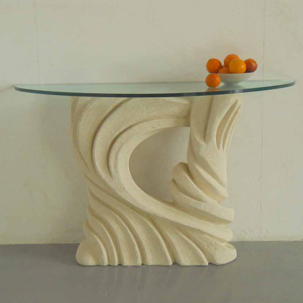 Konzolový stůl Vyrobeno v Itálii se základnou v přírodním kameni z Vicenzy, ručně vyřezávané z masivního bloku a 15 cm tlustého plaveného skla ve tvaru elipsy, spočívající na podstavci.