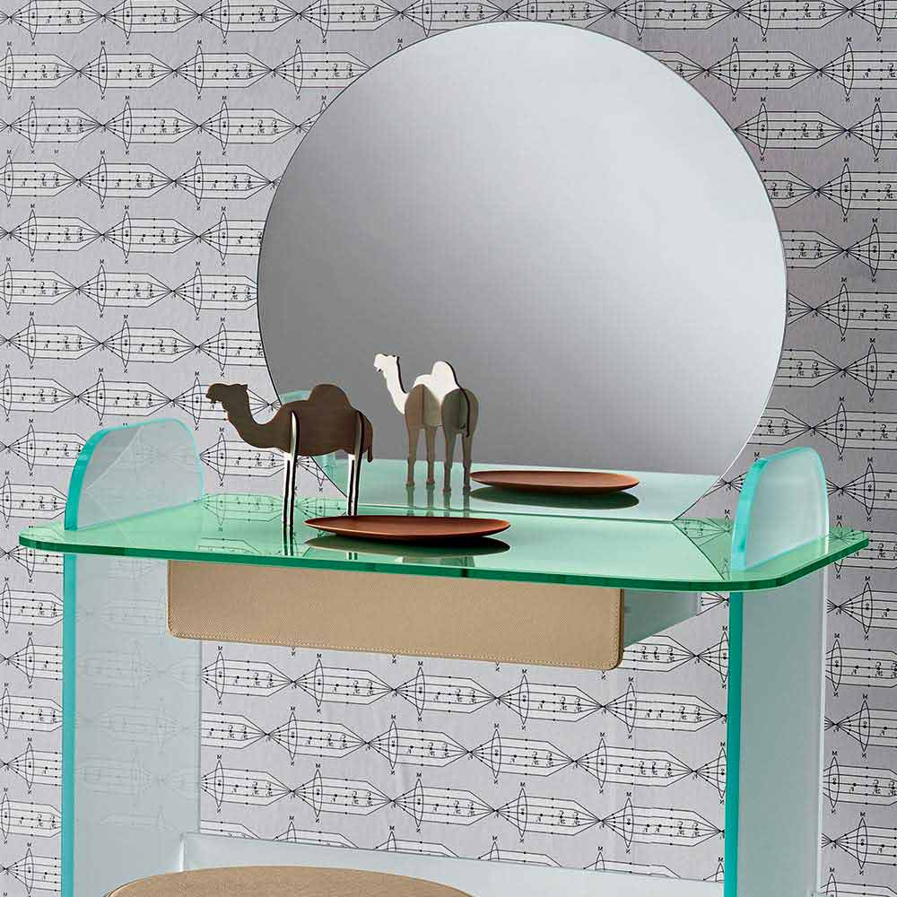 Symbol ženskosti a kultivovanosti, tento toaletní stolek má konstrukci zcela vyrobenou ze skla, která je k dispozici ve třech povrchových úpravách, a výsuvnou zásuvku z matně bílého dřeva nebo potaženou béžovou kůží.