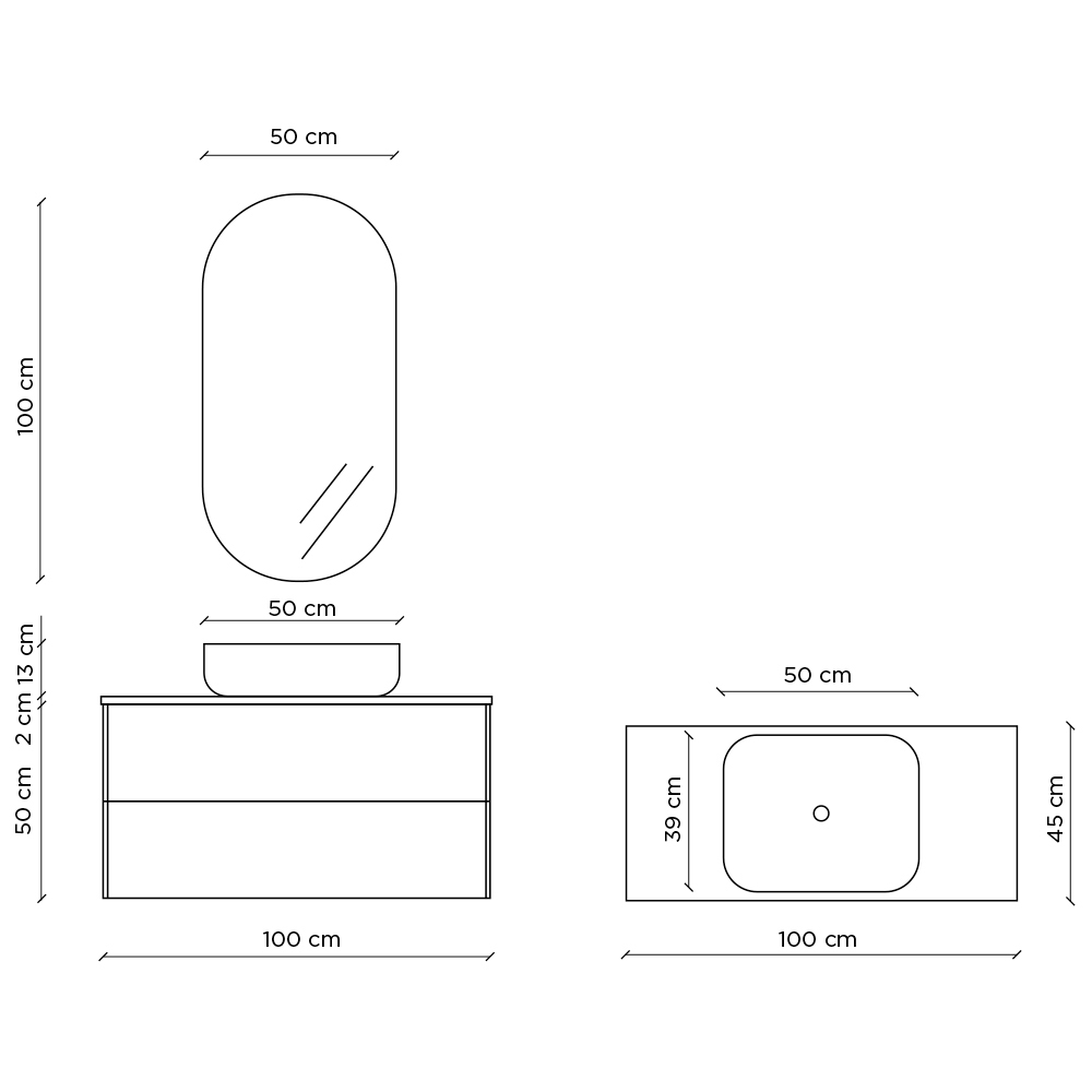 Koupelnová kompozice se základnou z melaminu odolného proti poškrábání se 2 plně vyjímatelnými zásuvkami a měkkým zavíráním v barvě kamene Havana , oválným zrcadlem a konzolovým umyvadlem z lesklé bílé keramiky .