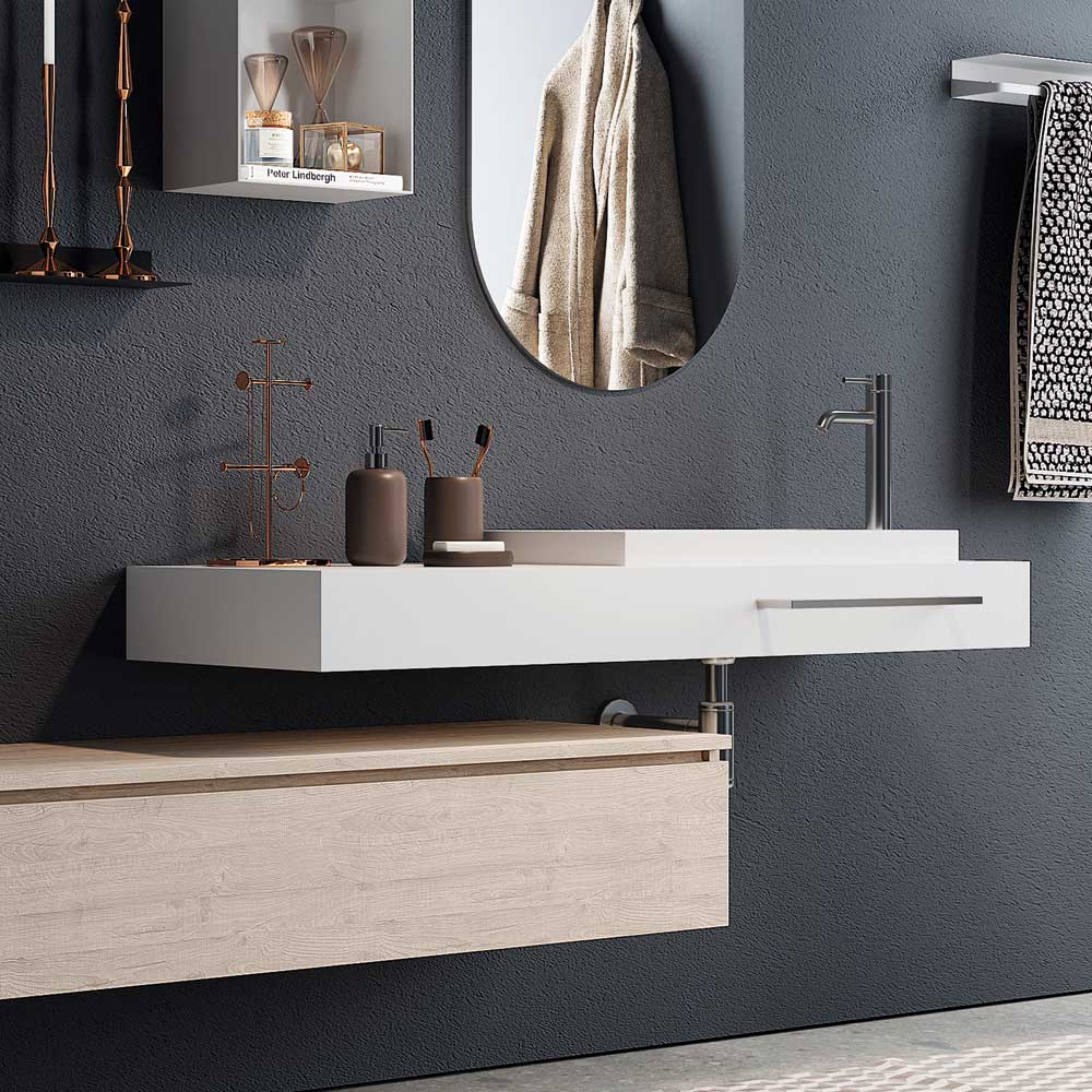 Koupelnová kompozice v moderním a minimalistickém stylu, která vyhovuje potřebám všech, kteří chtějí zařídit svou koupelnu s vkusem a rafinovaností. Kombinace materiálů a barev činí tyto výrobky jedinečnými a zaručují kvalitu a odolnost, které charakterizují veškerý koupelnový nábytek.