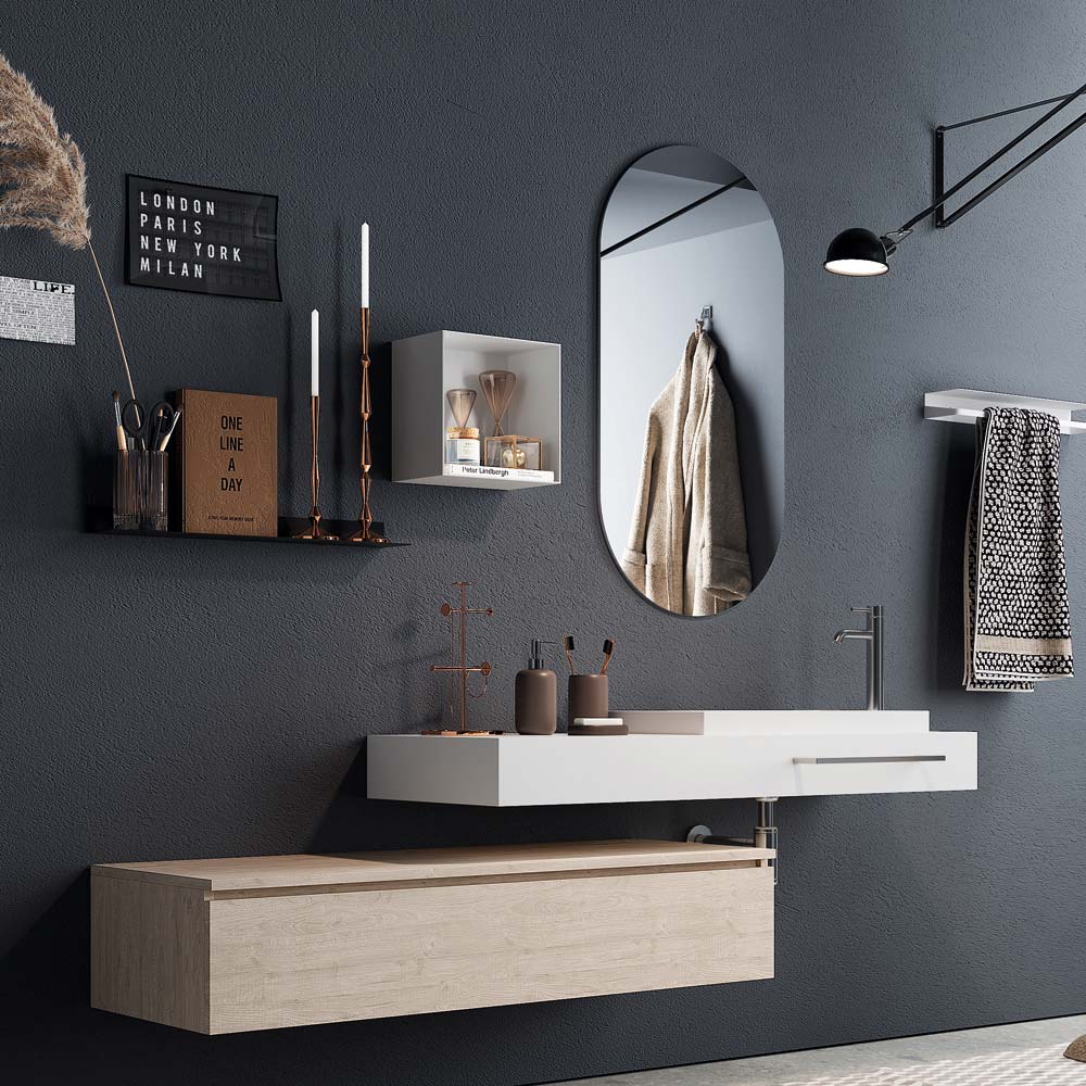 Koupelnová kompozice vyrobená v Itálii složená z oválného skleněného zrcadla , základna z přírodního dubového melaminu odolného proti poškrábání s plně vyjímatelnou kovovou zásuvkou a měkkým zavíráním . deska z povrstvené mdf a lesklé bílé hpl, na které spočívá bílé pryskyřičné umyvadlo.