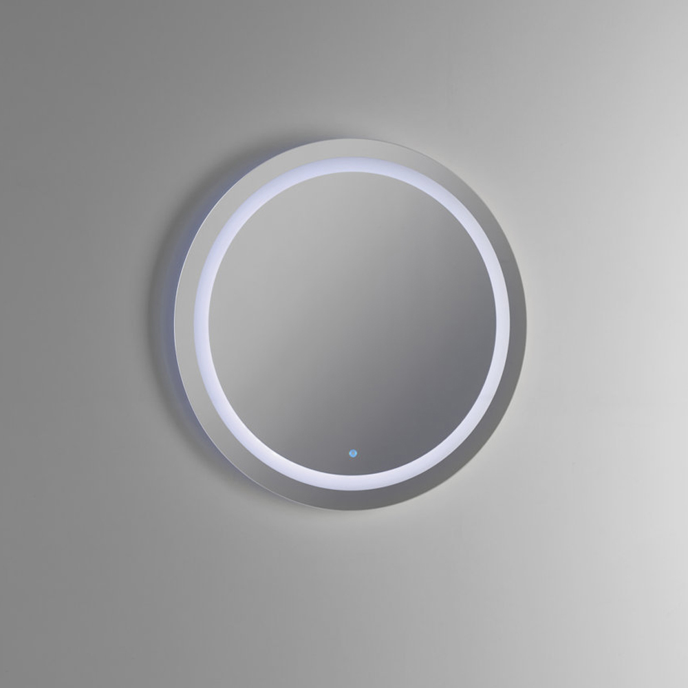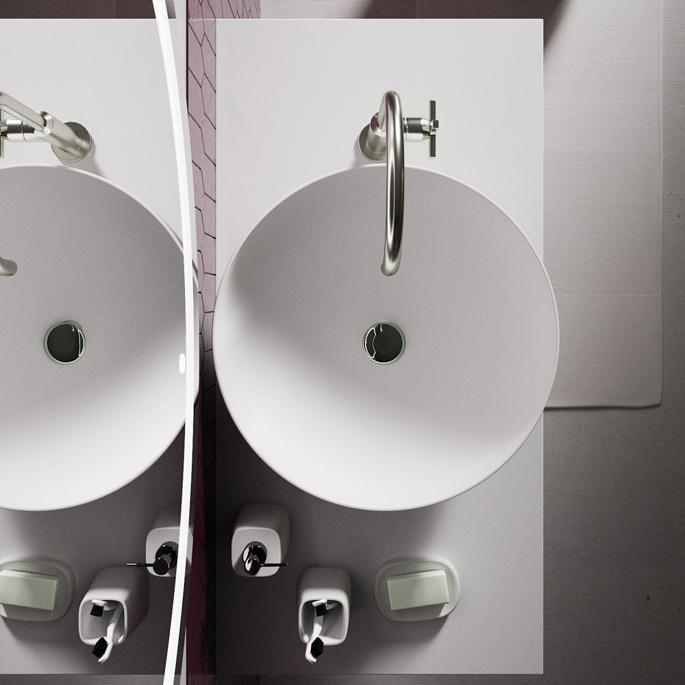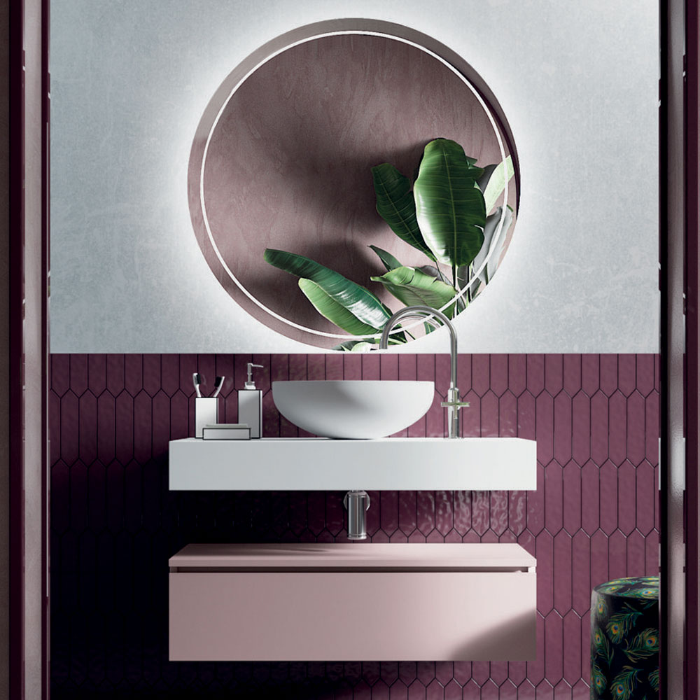 Koupelnová kompozice kompletně vyrobená v Itálii sestávající ze základny se zásuvkou ze světle růžové pryskyřice , vrchní deska z potažené MDF a bílé HPL , lesklý bílý pryskyřičný dřez a kulaté skleněné zrcadlo s dotykovou LED diodou .