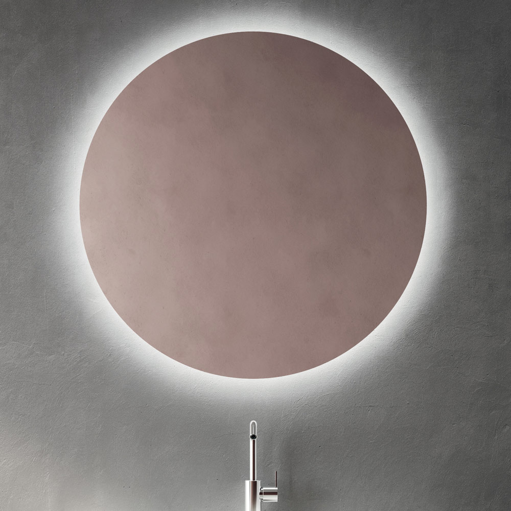 Kulaté zrcadlo s LED podsvícením zaujímá ústřední místo na zdi a nabízí rozptýlené, obklopující světlo, které zvýrazňuje oblast umyvadla a pomáhá vytvořit elegantní a dramatické prostředí koupelny.
