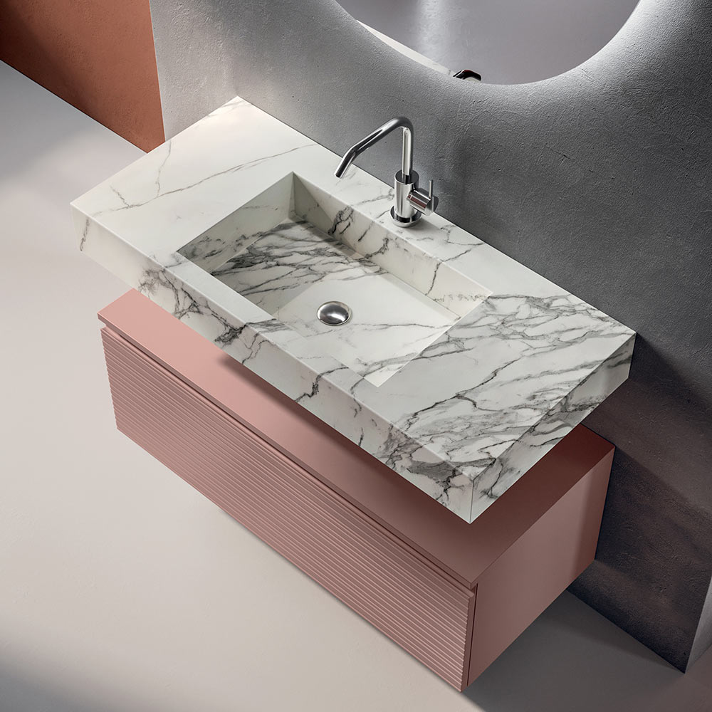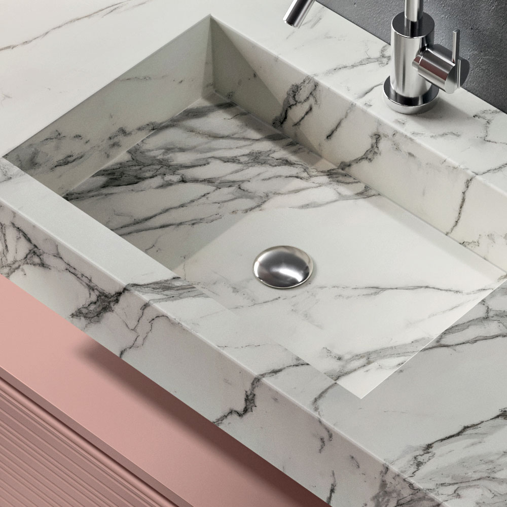 Umyvadlová deska z HPL s efektem Calacatta přináší materiálový nádech s velkým vizuálním dopadem: estetika inspirovaná mramorem dodává jas a hodnotu a zároveň si zachovává vysoký výkon z hlediska odolnosti a praktičnosti pro každodenní použití.