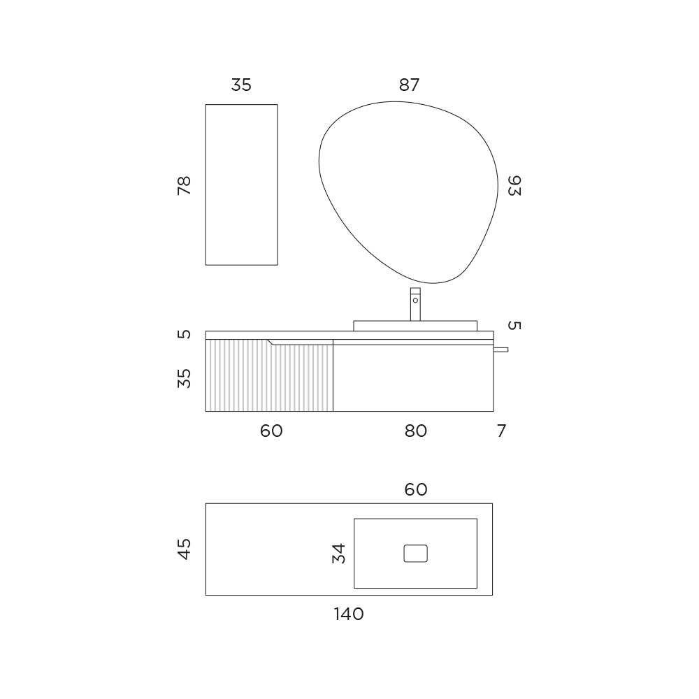 - Umyvadlo: Délka 60 cm x Hloubka 34 cm x Výška 15,7 cm