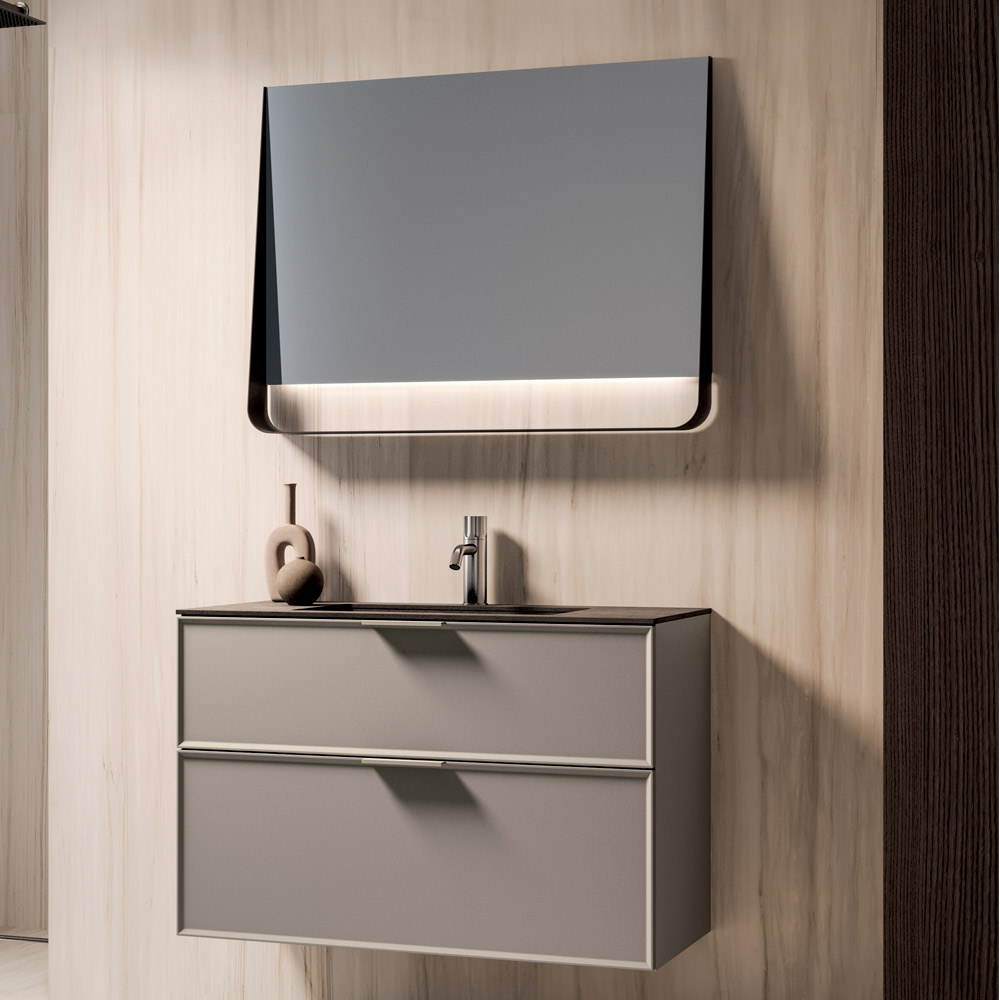 Kompozici doplňuje zrcadlo Wing LED s matným černým rámem, které je navrženo tak, aby poskytovalo rovnoměrné a funkční osvětlení, ideální do oblasti umyvadla a pro zlepšení vizuálního komfortu.