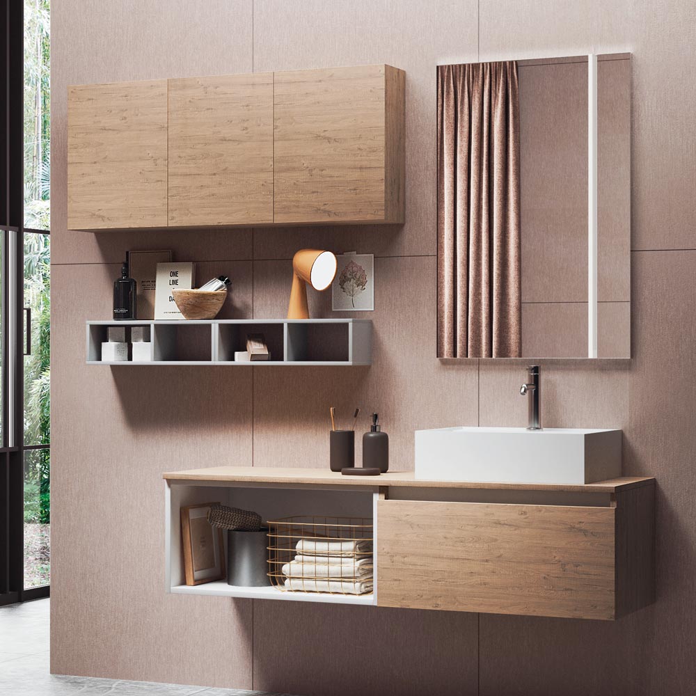 Koupelnová kompozice s bílým keramickým umyvadlem , zrcadlo s ABS rámem s přední LED, zavěšená základna z melaminu odolného proti poškrábání s povrchem medový dub s plně vyjímatelnou zásuvkou a měkkým zavíráním a lesklou bílou otevřenou stěnou .