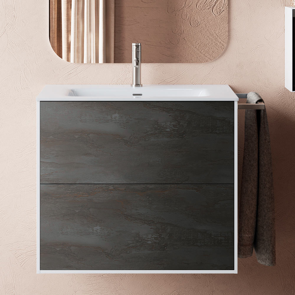 Koupelnová kompozice kompletní s lesklým bílým keramickým umyvadlem , skleněným zrcadlem s lampou a melaminovým podstavcem odolným proti poškrábání v barvě oxidu se 2 plně vyjímatelnými zásuvkami s měkkým zavíráním.