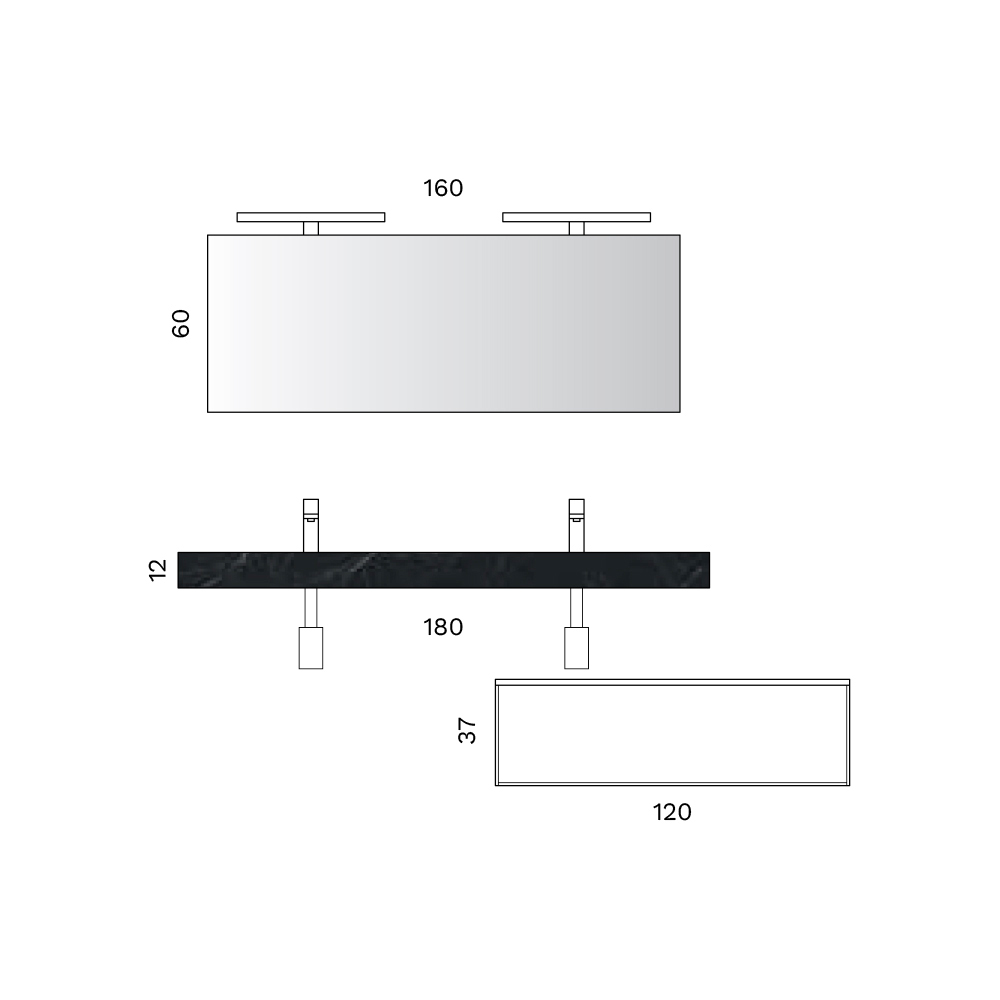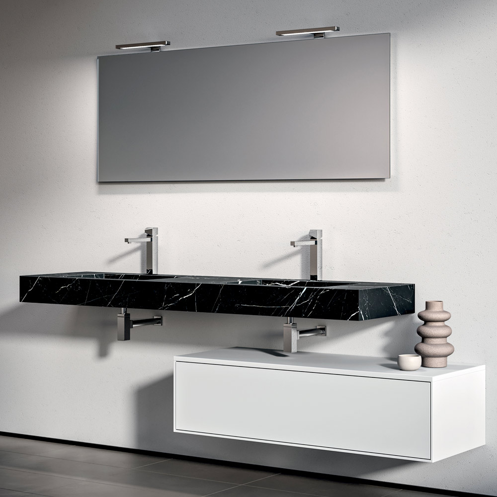 Dramatická a moderní koupelnová kompozice, navržená pro velké a sofistikované prostory. Vrchní deska z HPL s efektem Marquina dodává dvojí umyvadlo charakter a vizuální hloubku a vytváří rafinovaný kontrast s matně bílou základnou.