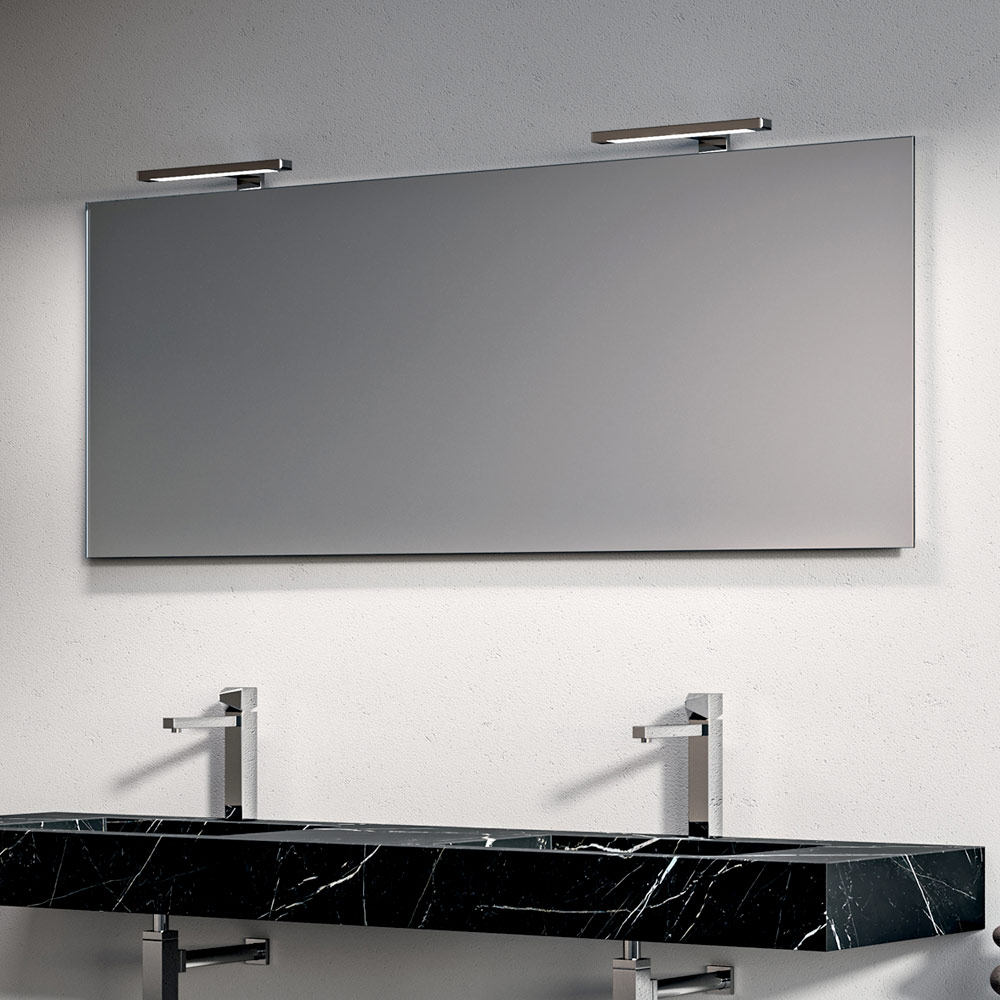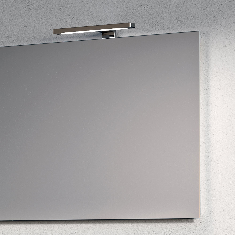 Podsvícené zrcadlo opticky zvětšuje prostor a rozptyluje rovnoměrné, obklopující světlo, doplněné elegantními chromovanými LED lampami, které dodávají prostoru jasný a moderní nádech.