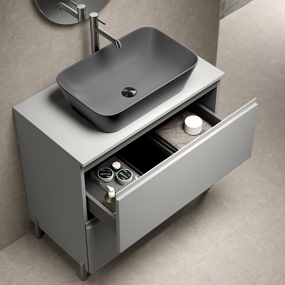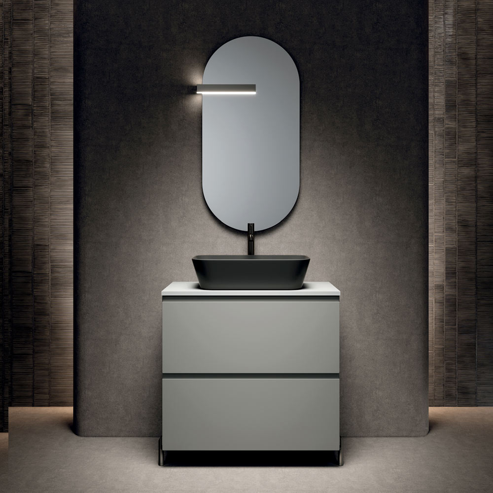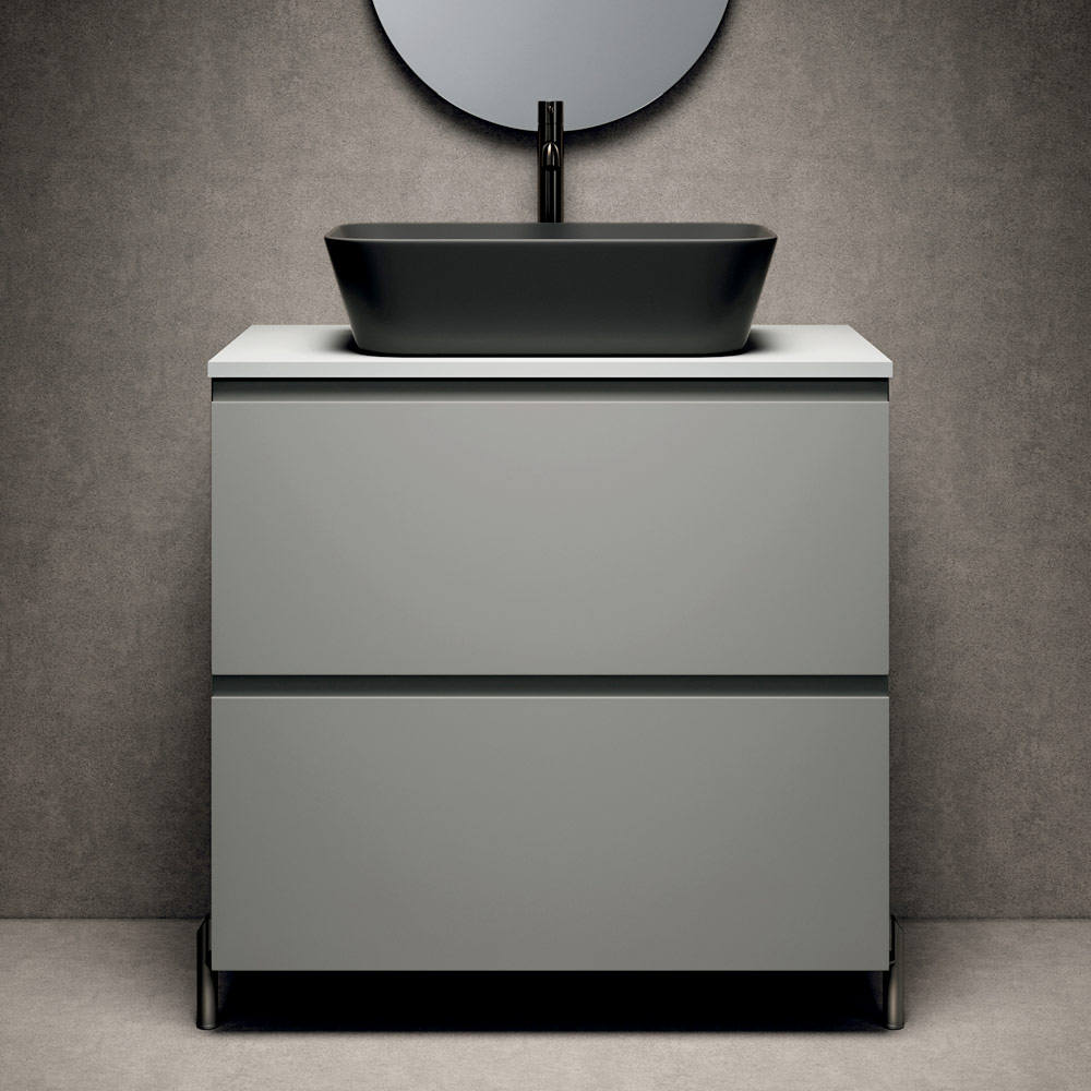 Řešení určené pro ty, kteří chtějí moderní koupelnovou skříňku s nožičkami , která se vyznačuje trendy matnými povrchovými úpravami a antracitovými detaily se silným estetickým dopadem.