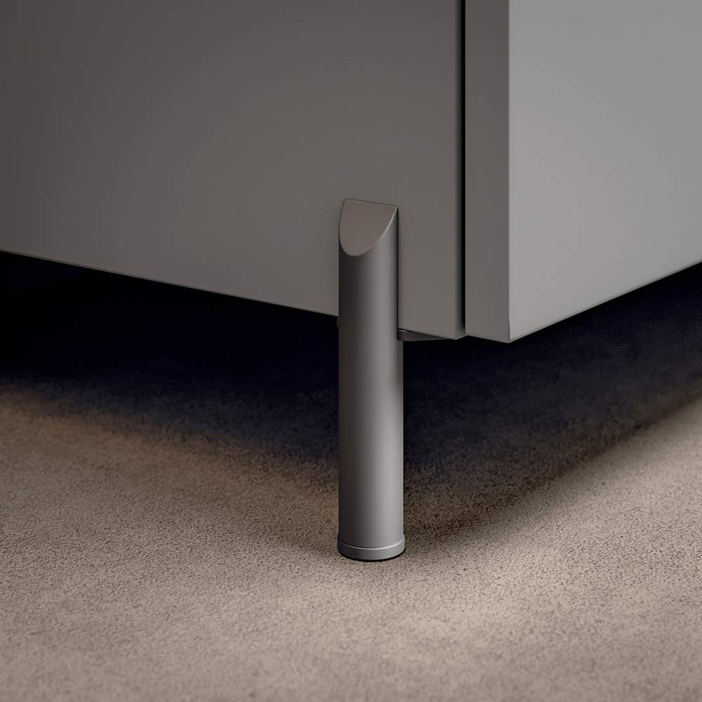 Podstavec se dvěma velkými zásuvkami v matně šedé povrchové úpravě zaručuje dostatek úložného prostoru a čistý estetický vzhled, který umocňují 8 cm vysoké antracitové vnější nohy , které dodávají skříňce optickou lehkost a větší stabilitu.