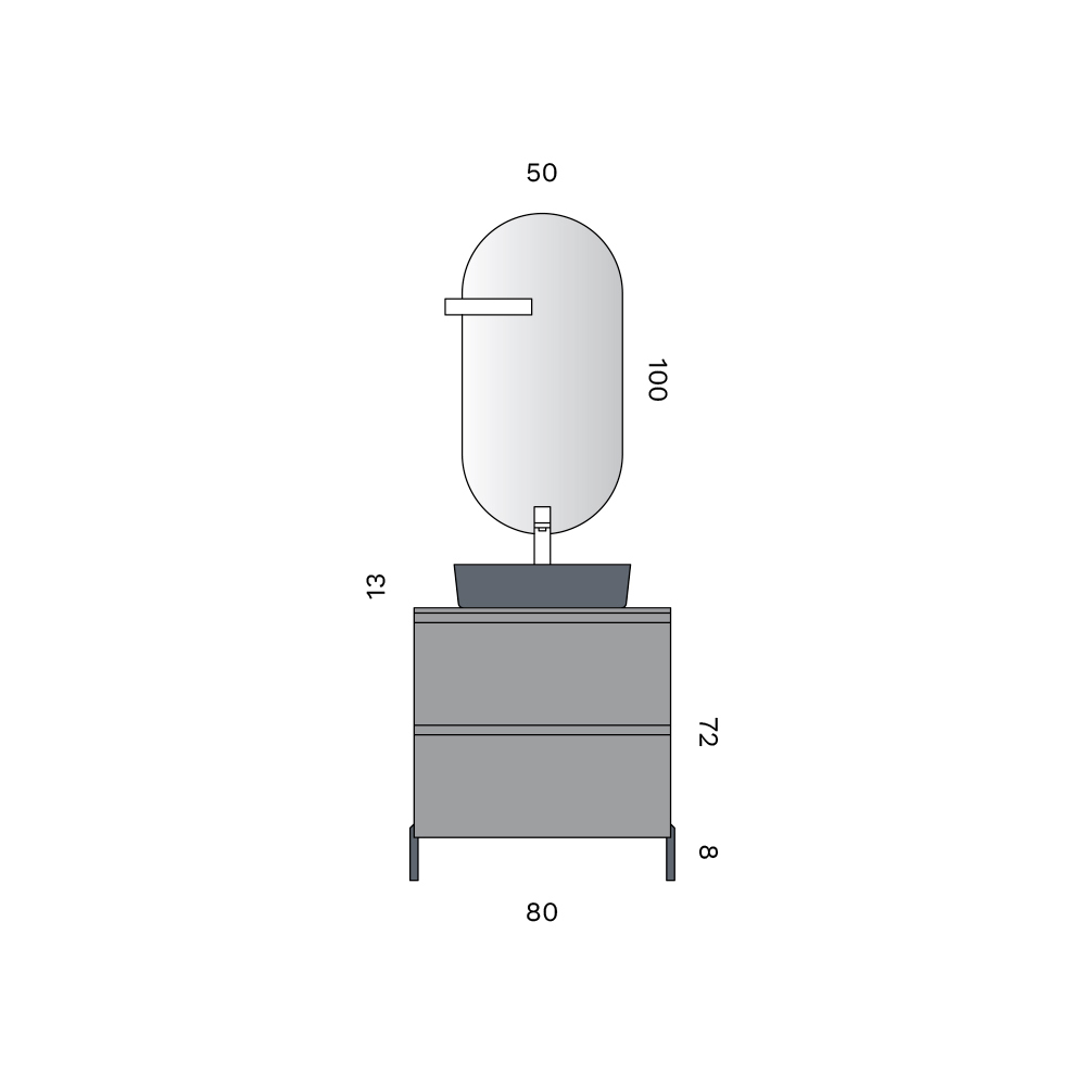 Umyvadlo z antracitové pryskyřice se stává skutečným protagonistou kompozice: moderní, odolné a se silným vizuálním dopadem, vytváří elegantní kontrast s lehkou strukturou podstavce.