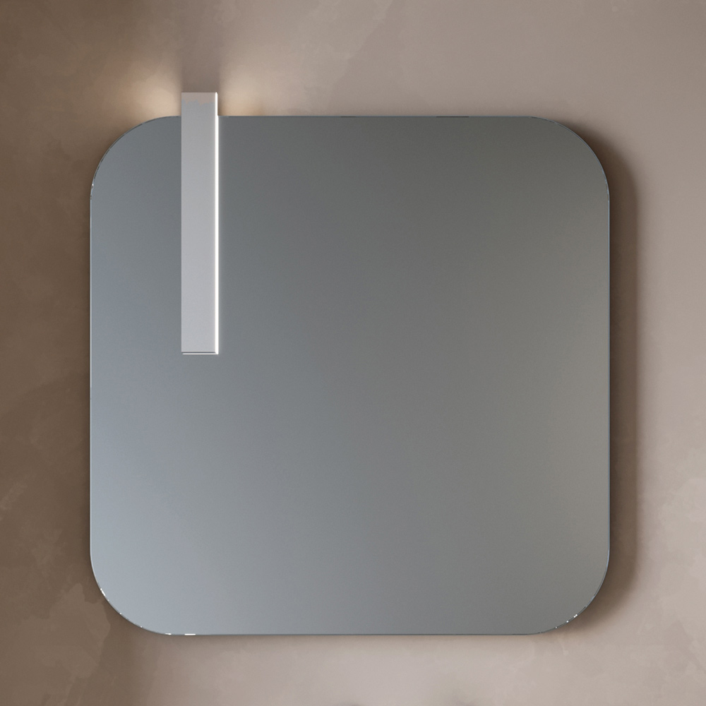 Tvarované zrcadlo dodává kompozici charakter a osobitost, zatímco LED lampa s chromovanou povrchovou úpravou zajišťuje elegantní a funkční osvětlení, ideální do oblasti umyvadla.