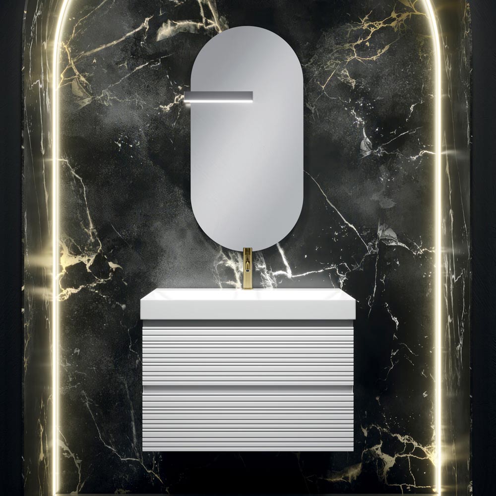 Elegantní zavěšená koupelnová kompozice s moderním designem, koncipovaná pro kultivované prostředí, ve kterém se harmonicky prolíná estetika, světlo a funkčnost.