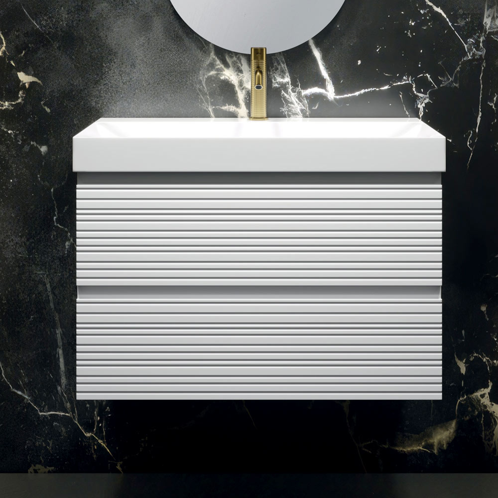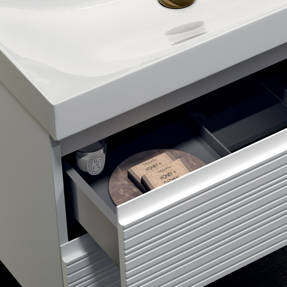 Závěsná koupelnová skříňka se dvěma zásuvkami , vyrobená v sofistikované matně bílé povrchové úpravě , nabízí dostatek úložného prostoru a čistý estetický vzhled, ideální pro vylepšení moderního a světlého prostředí.