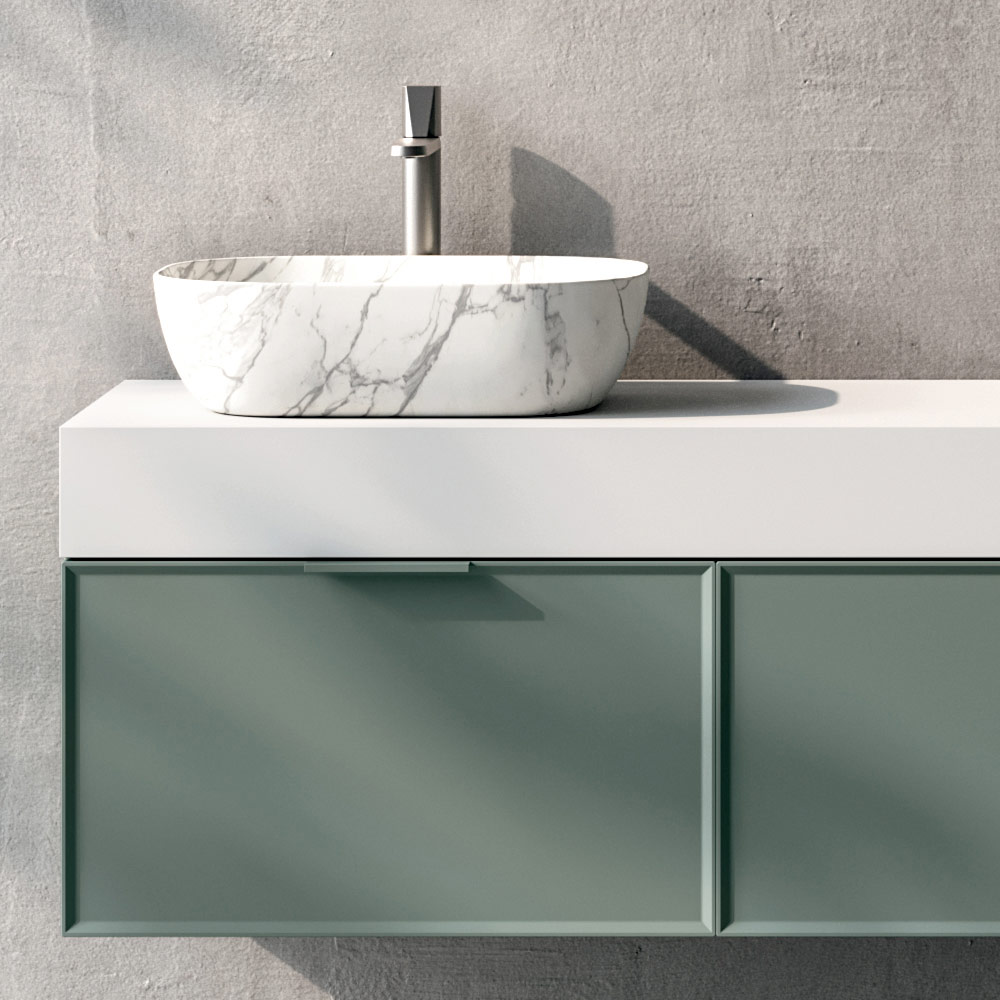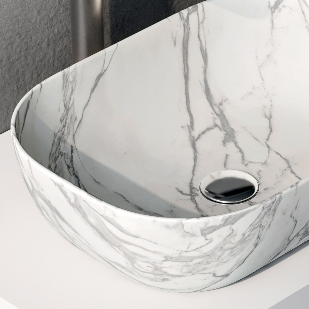 Matně bílá deska umyvadla harmonicky doplňuje keramické umyvadlo s efektem Calacatta , které se vyznačuje světlým povrchem a jemným žilkováním připomínajícím mramor, což celou kompozici umocňuje.