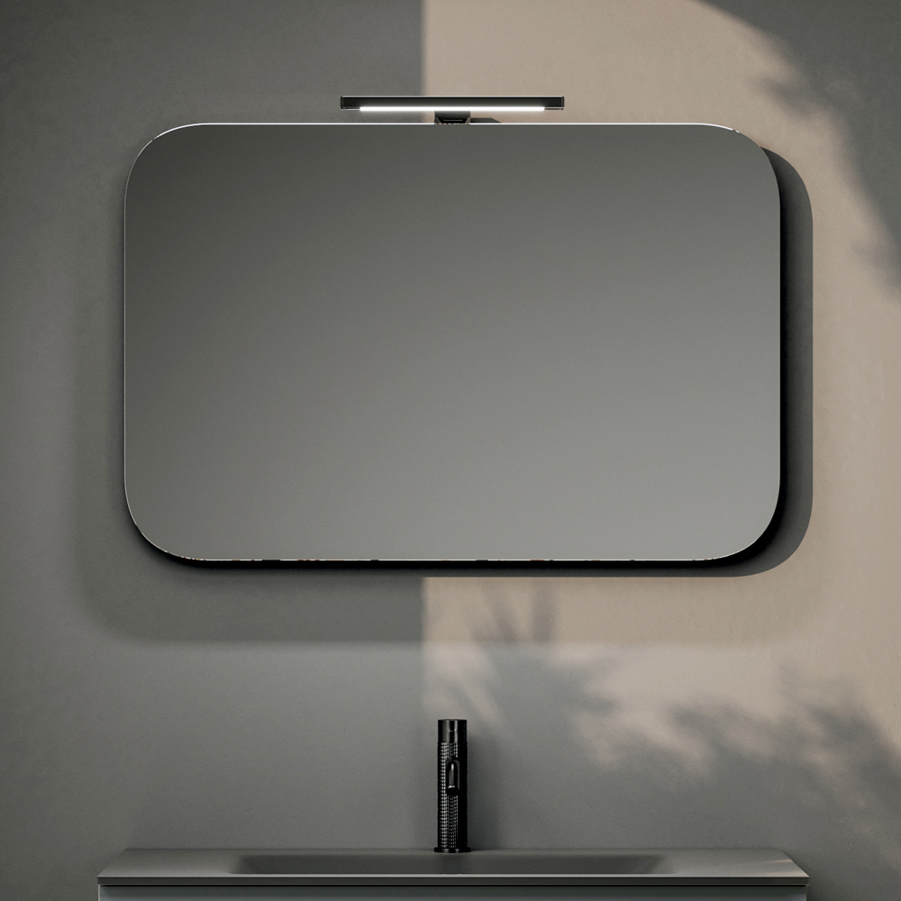 Černá LED lampa doplňuje kompozici výrazným grafickým akcentem a nabízí funkční a scénografické osvětlení, ideální pro vytvoření intimní a sofistikované atmosféry v oblasti umyvadla.