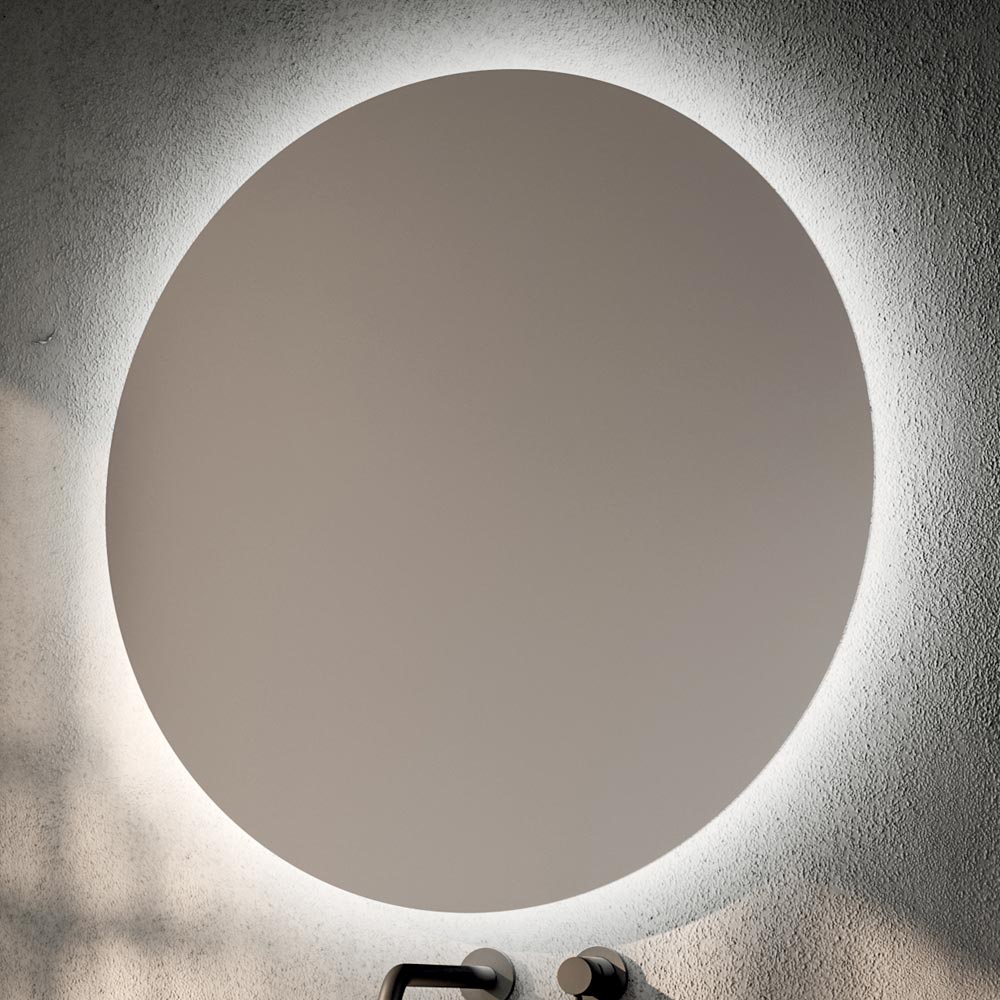 Kulatý pryskyřičný dřez s jemným, minimalistickým profilem dokonale ladí s pracovní deskou, zatímco podsvícené zrcadlo zesiluje jas a dodává stěně vizuální hloubku, což pomáhá vytvořit relaxační a moderní atmosféru.