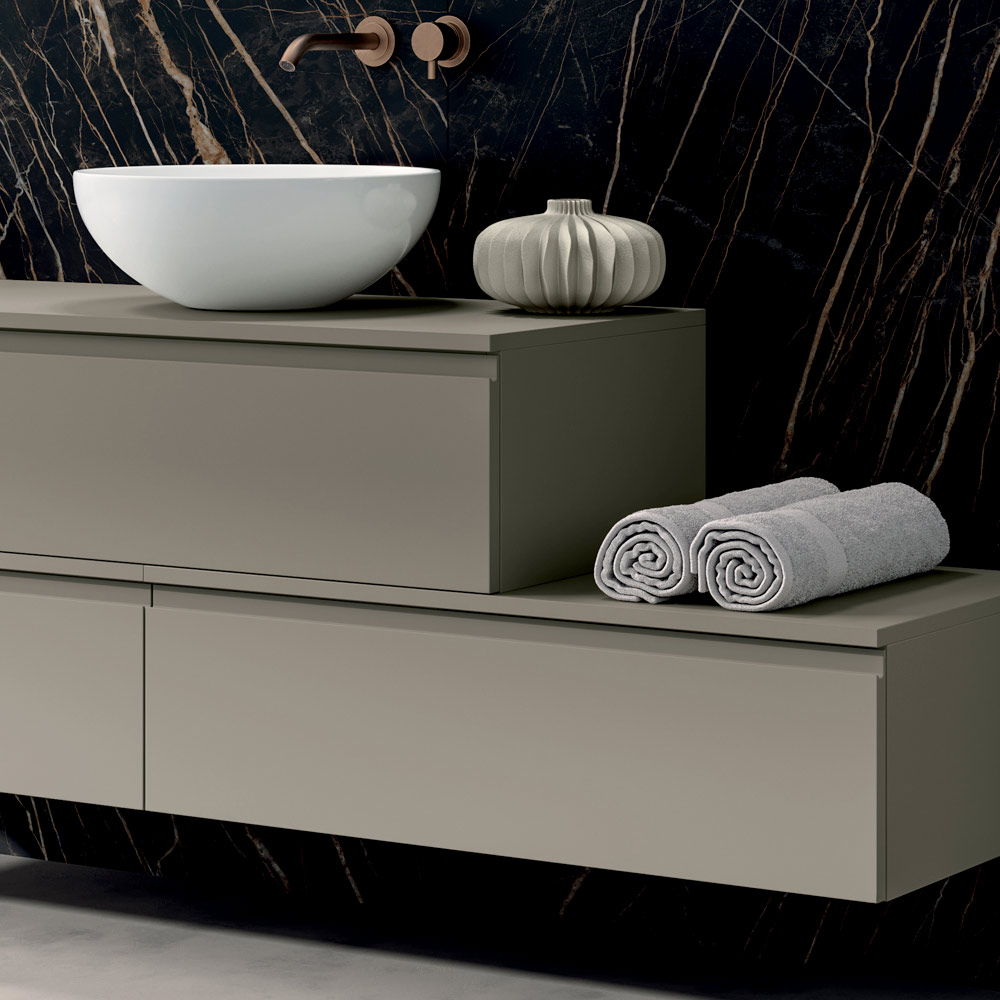 Konstrukce se skládá ze dvou nástěnných základních skříněk, každá s jednou zásuvkou v matné holubí šedé barvě , které nabízejí dostatek úložného prostoru a přehledné uspořádání prostoru. Integrovaný sifon zachovává čistou, minimalistickou estetiku a umocňuje vizuální kontinuitu celkového designu.