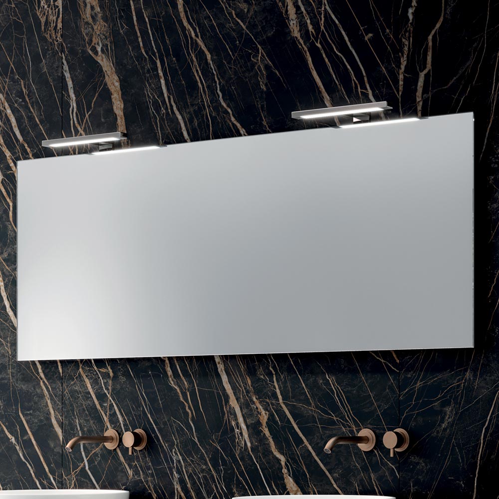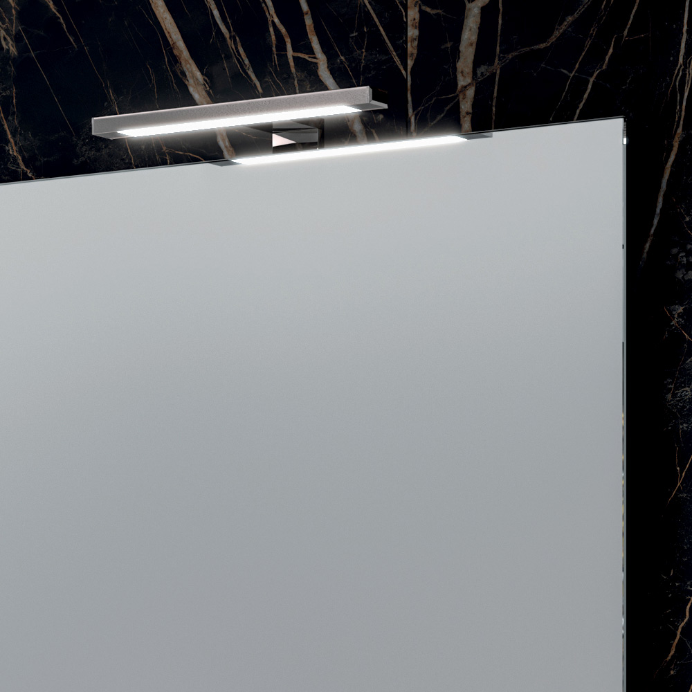 Obdélníkové zrcadlo zesiluje jas a dodává prostoru hloubku, zatímco chromované LED lampy dodávají elegantní a funkční osvětlení, které je ideální pro zvýraznění prostoru u dřezu.