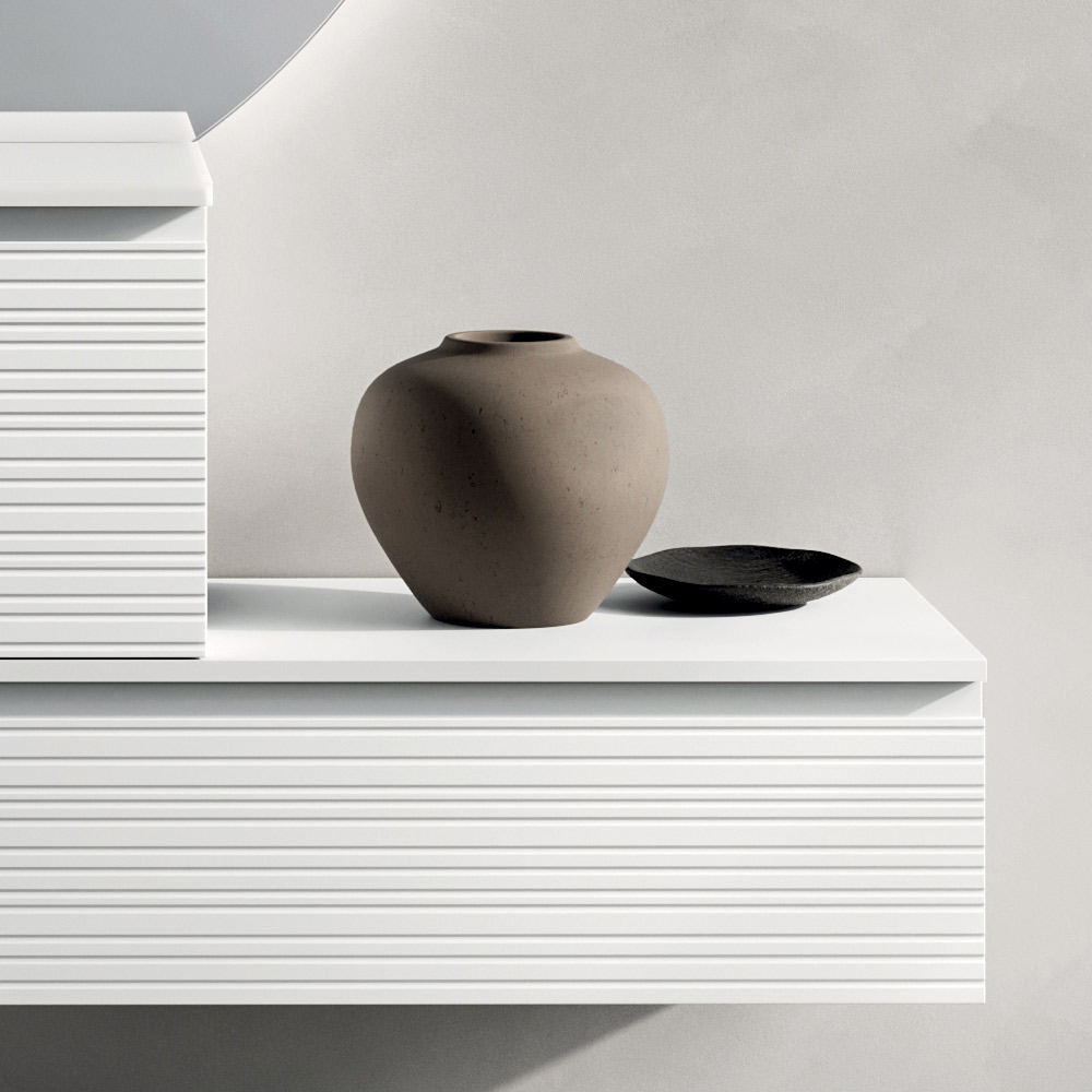 Matně bílá závěsná koupelnová skříňka se vyznačuje čistými liniemi a vyváženými proporcemi a nabízí funkční a diskrétní úložné řešení. Matný povrch zvýrazňuje čistotu barvy, díky čemuž je tato kompozice ideální jak pro obytné prostory, tak pro luxusní smluvní projekty.