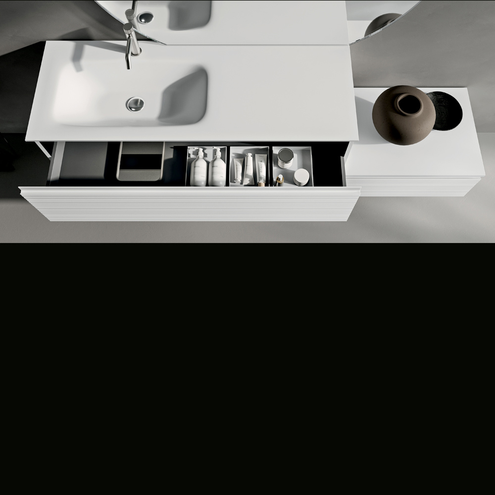 Elegantní zavěšená koupelnová kompozice s jednoduchým a moderním designem, navržená tak, aby vylepšila moderní prostory světlým a rafinovaným stylem.