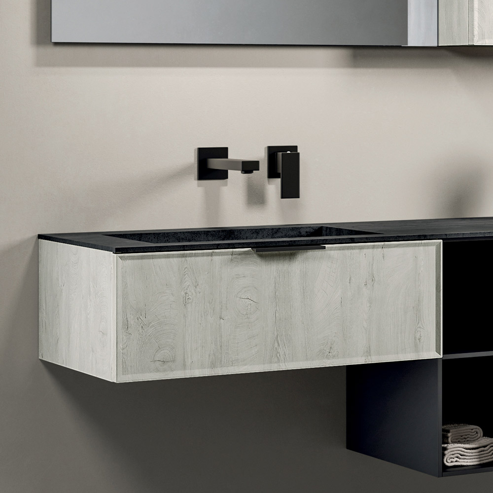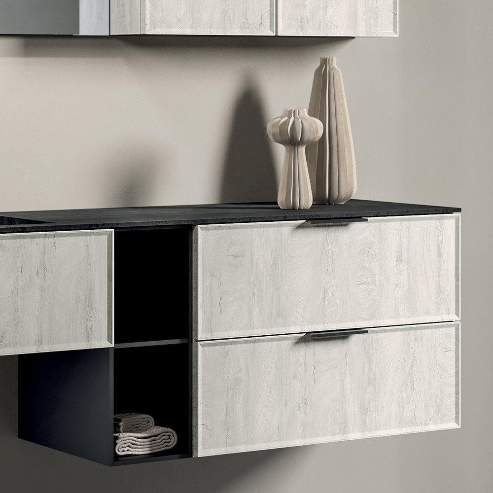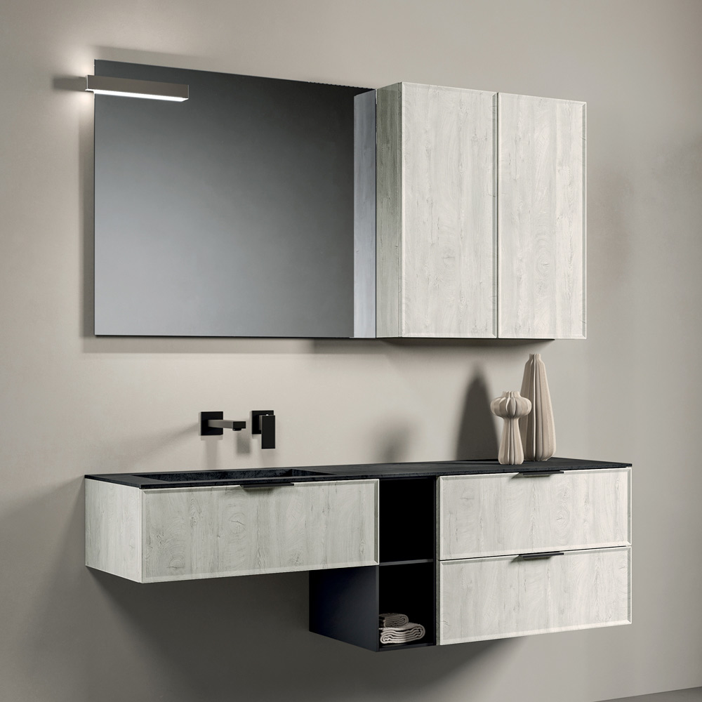 Kompozice integruje velkou a prostornou základnu se zásuvkami (první zásuvka je zavřená), navrženými pro zajištění pořádku a každodenní praktičnosti, lemovanou dvěma horními skříňkami , které rozšiřují úložný prostor a zároveň zachovávají lehký a vyvážený estetický vzhled.