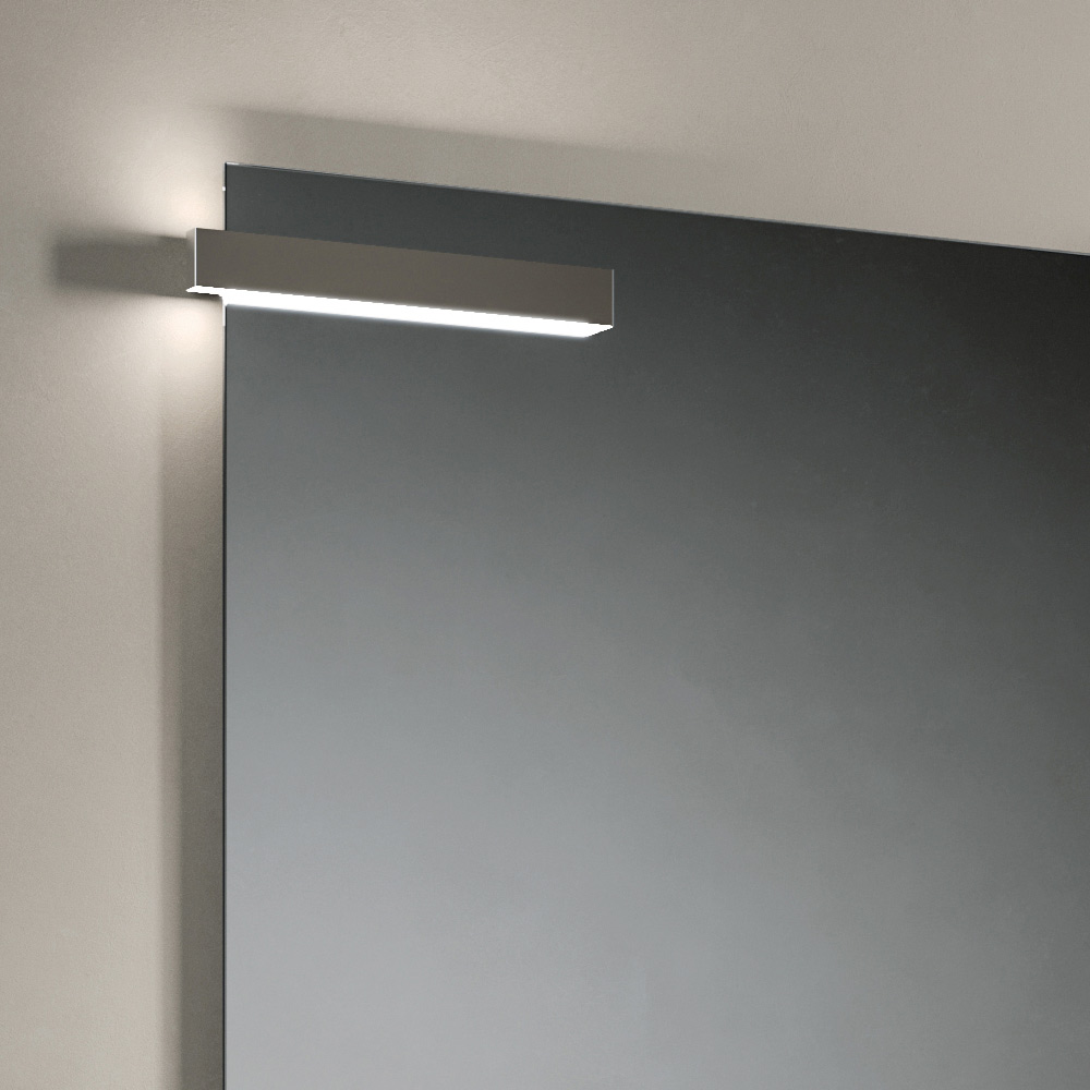 Kompozici doplňuje obdélníkové zrcadlo a LED lampa , které zajišťují funkční a scénografické osvětlení, ideální pro zvýraznění prostoru umyvadla a zlepšení vizuálního komfortu.