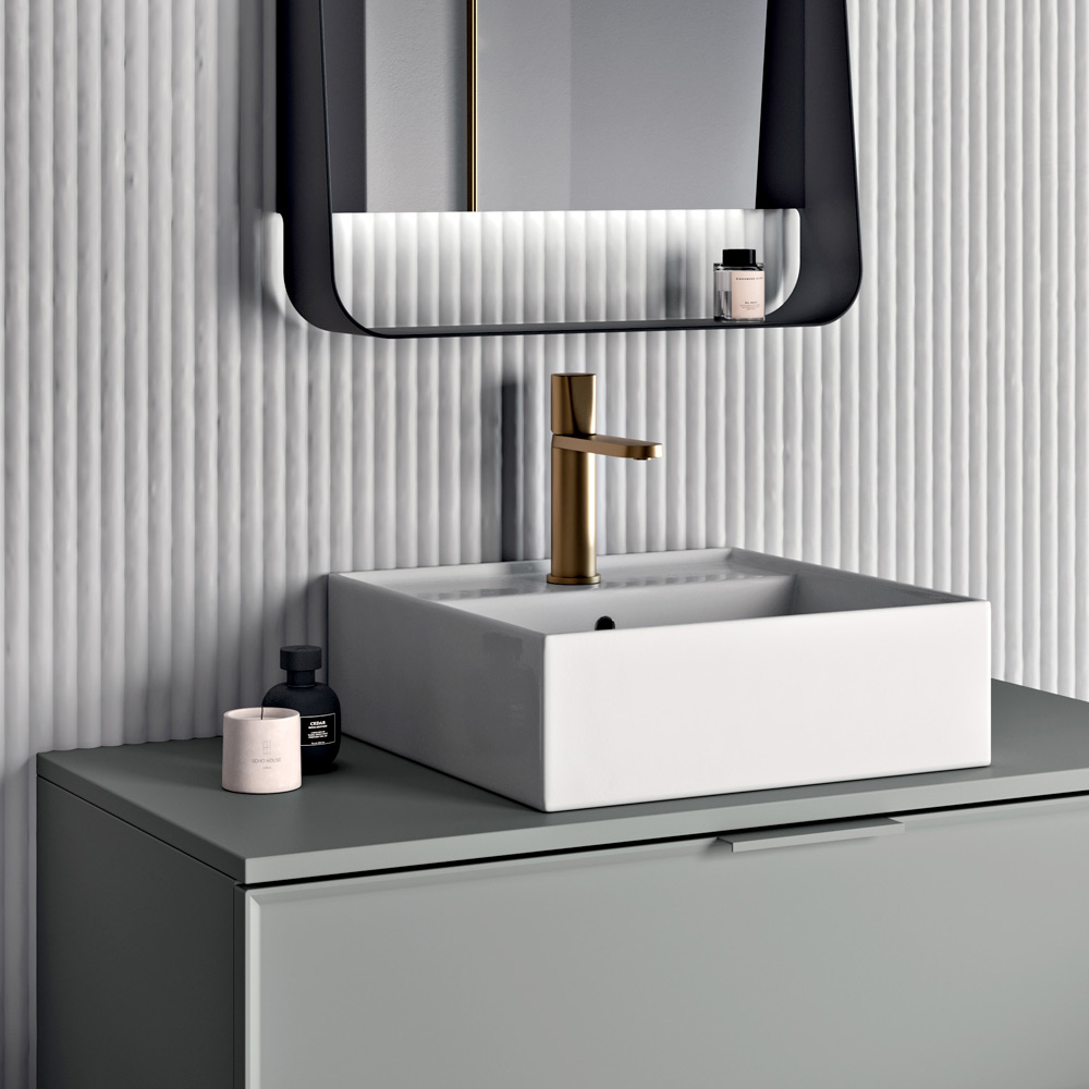 Celek doplňuje koupelnové zrcadlo Wing LED s matným černým rámem , prvek s výraznou osobností, který zajišťuje funkční a zároveň dekorativní osvětlení a vylepšuje tak celou oblast umyvadla.