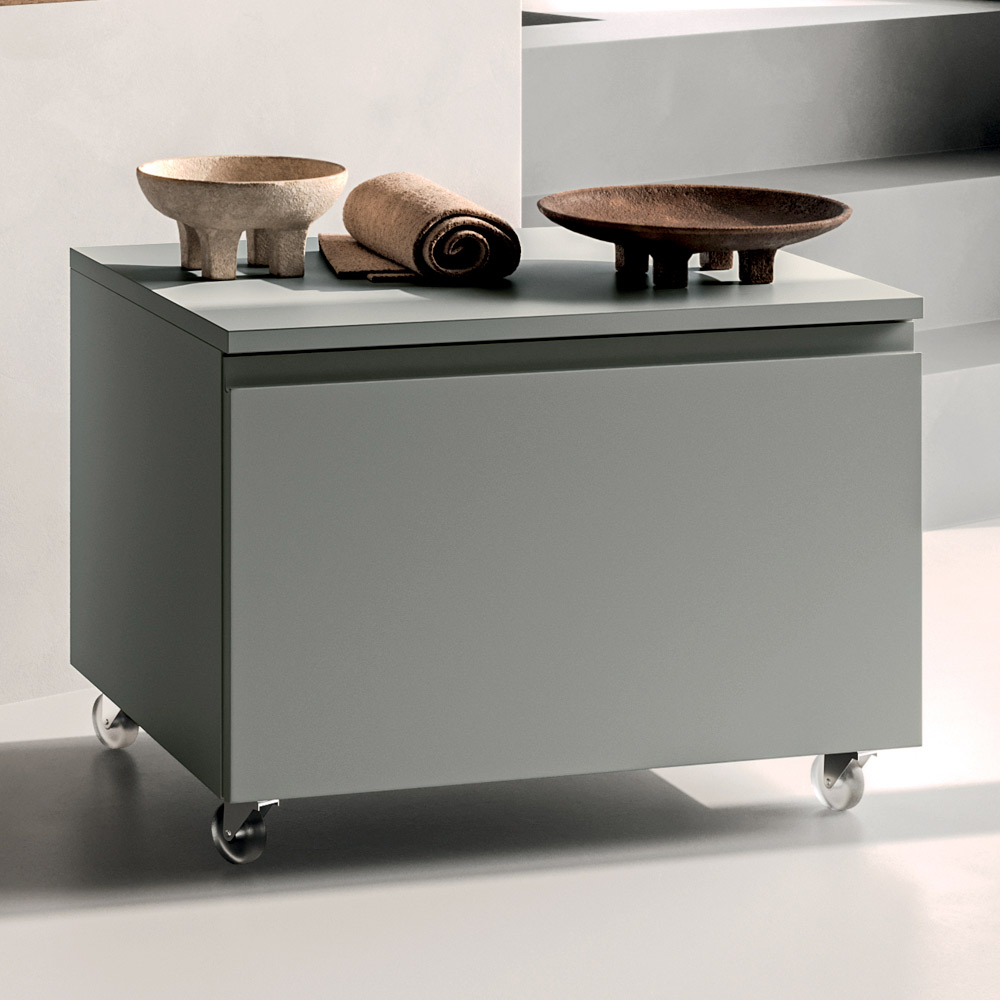 Spodní skříňka se zásuvkou poskytuje praktický a dobře organizovaný úložný prostor, ideální pro udržení pořádku v prostoru bez kompromisů v estetickém provedení. Matně šedá povrchová úprava dodává kompozici texturovaný, moderní vzhled, který snadno doplní různé styly interiéru. Kolečka umožňují flexibilní řízení prostoru, což je ideální pro moderní koupelny, smluvní projekty nebo nekonvenční řešení zařízení, což kompozici činí ještě všestrannější.