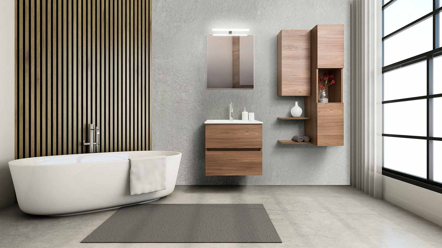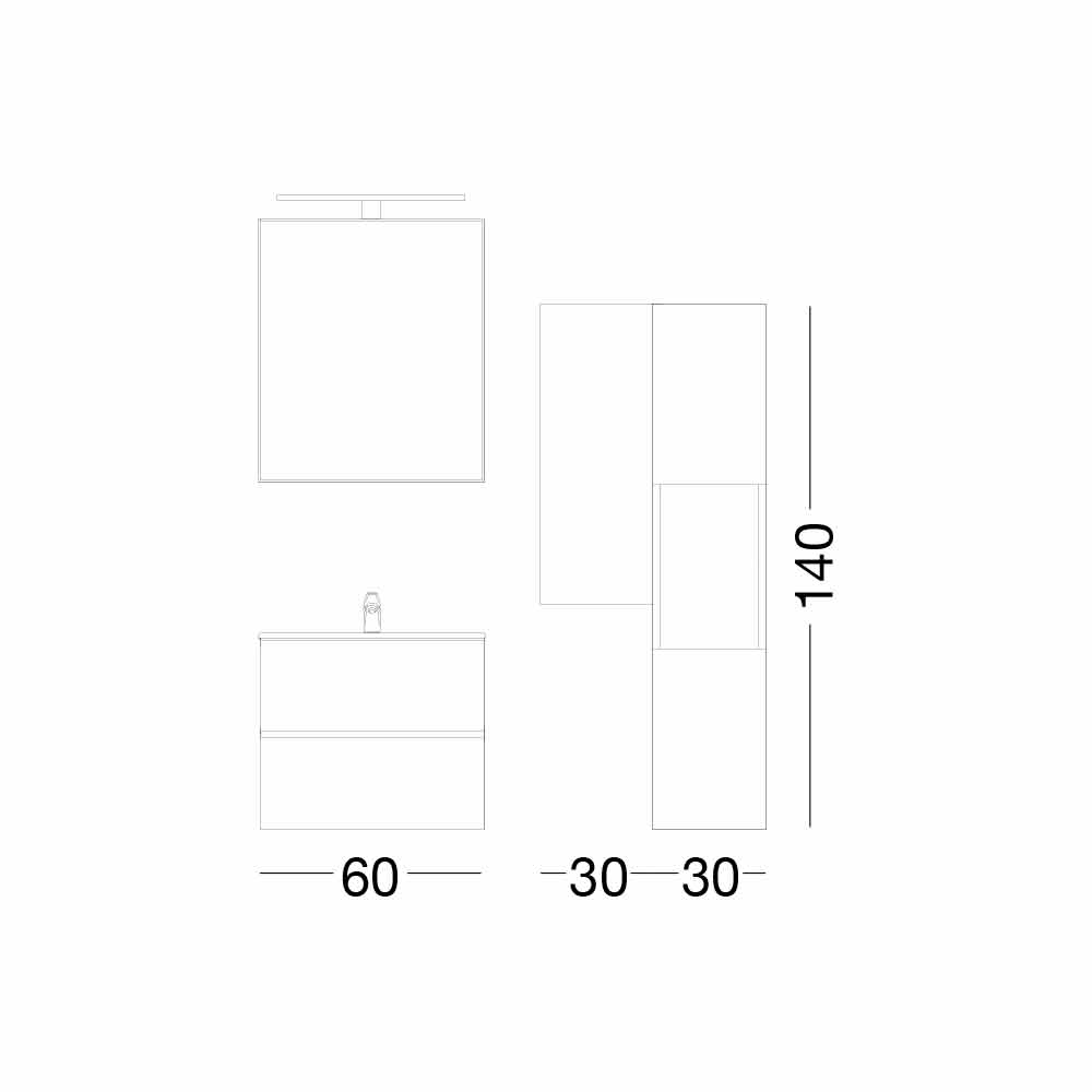 Koupelnová skříňka 60 cm, designové umyvadlo, zrcadlo, sloupek a nástěnná jednotka.