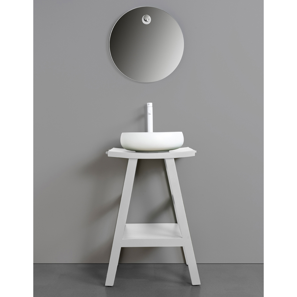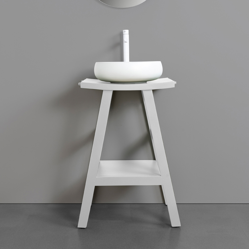 Volně stojící koupelnová skříňka vyrobená z přírodního regenerovaného teaku s matnou bílou barvou, čistý a elegantní odstín , který připomíná oslnivý odraz sněhu na slunci a dokonale ladí s teakovým dřevem pro výsledek se silnou scénografickou osobností. Jeho struktura se vyznačuje mírně zakřiveným tvarem svršku, který nabízí exkluzivní a rafinovaný dotek estetiky produktu. Kompletní se 4 praktickými háčky na ručníky a funkční odkládací policí .