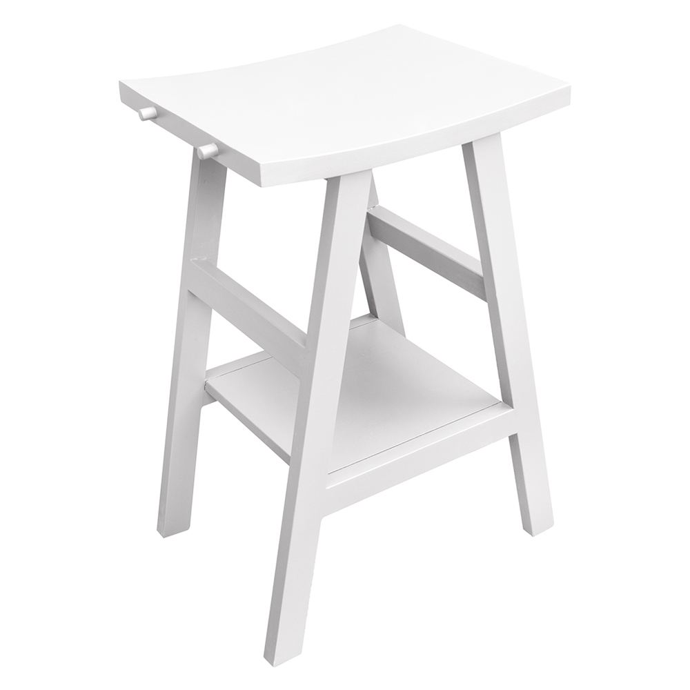 Matně bílá koupelnová skříňka z přírodního teaku s háčky a policí.