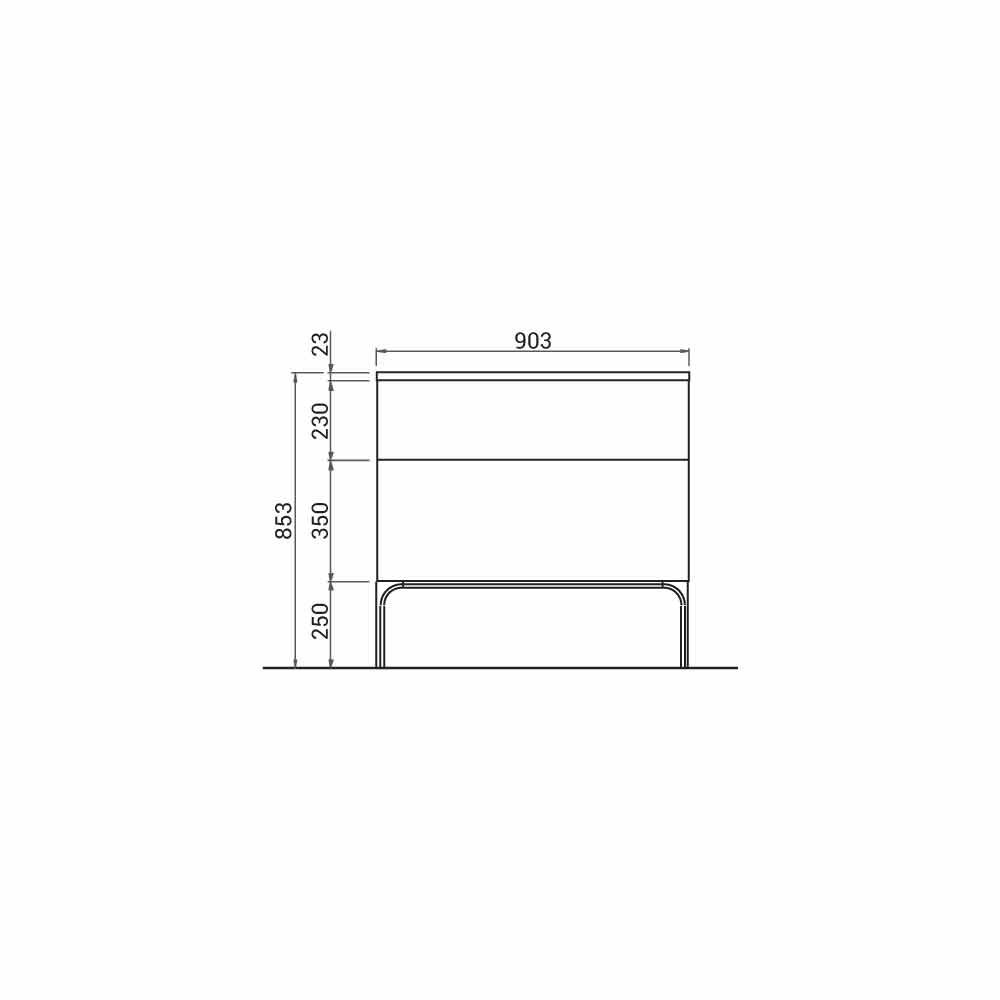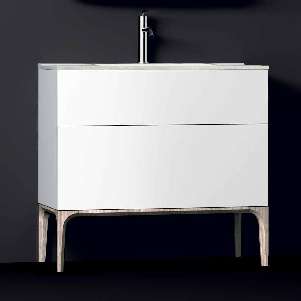 Elegantní umyvadlová skříň se dvěma zásuvkami s pevnými a harmonickými liniemi v lakovaném dřevě s přírodními dubovými masivními nohami. Integrovaná vrstva pryskyřice dostupná v různých provedeních.