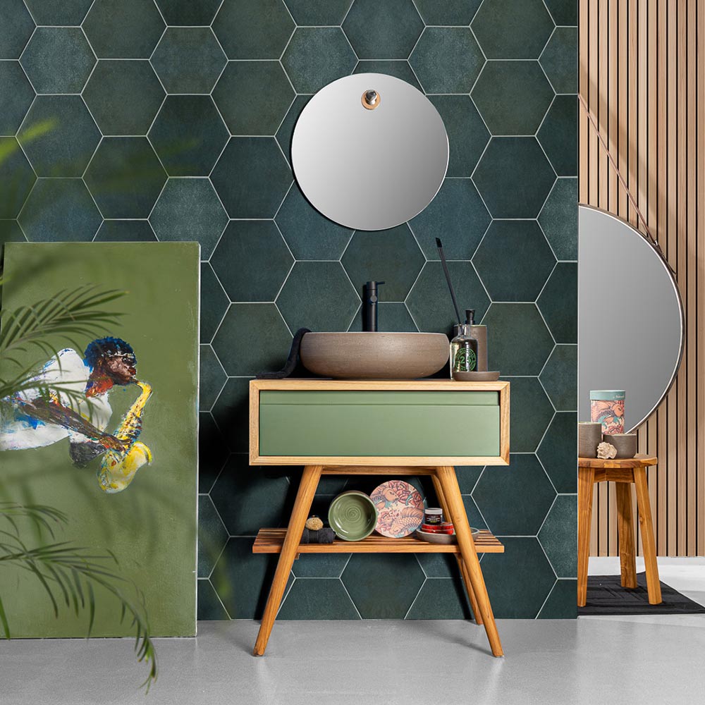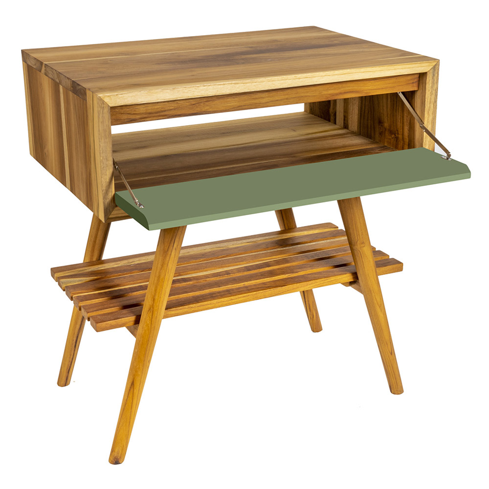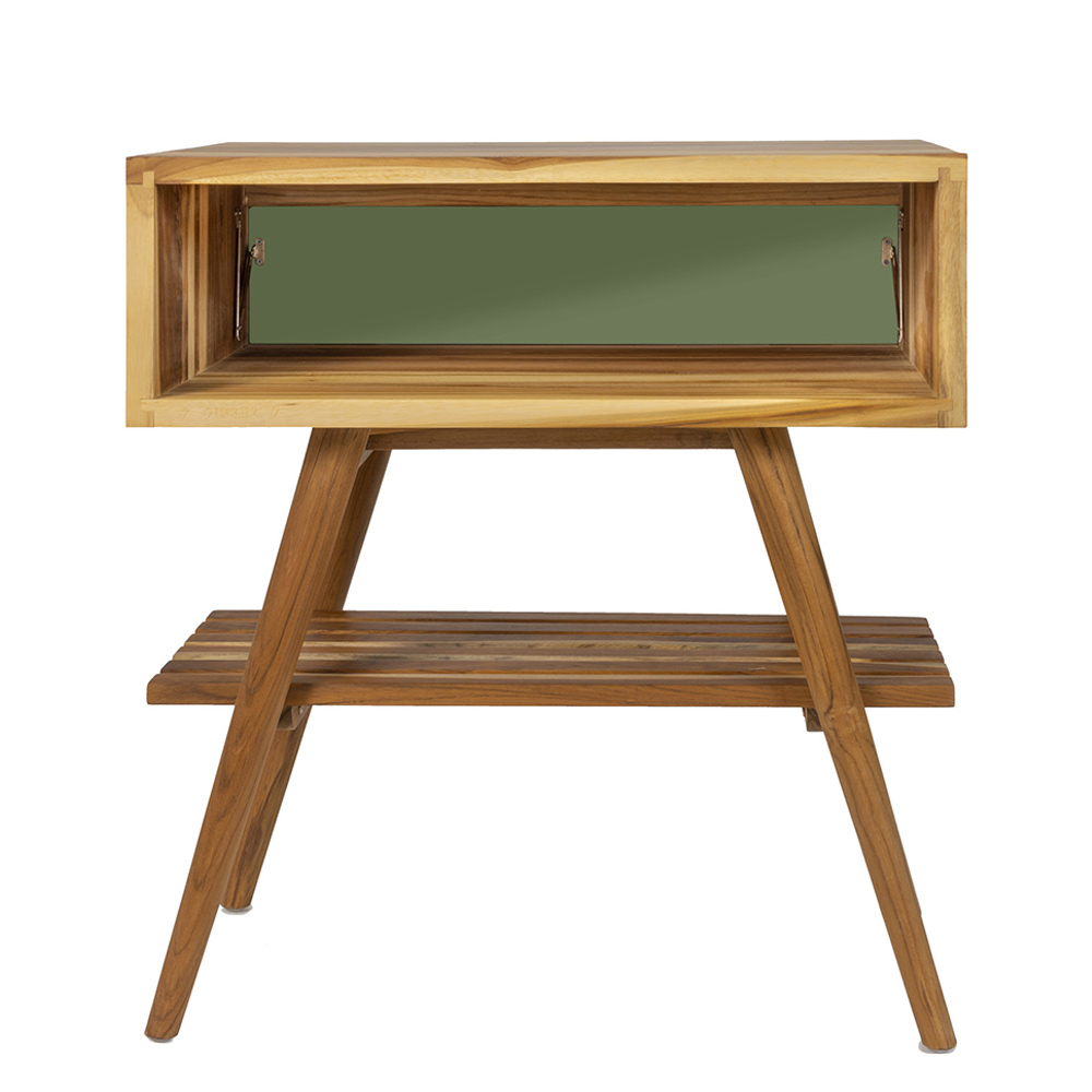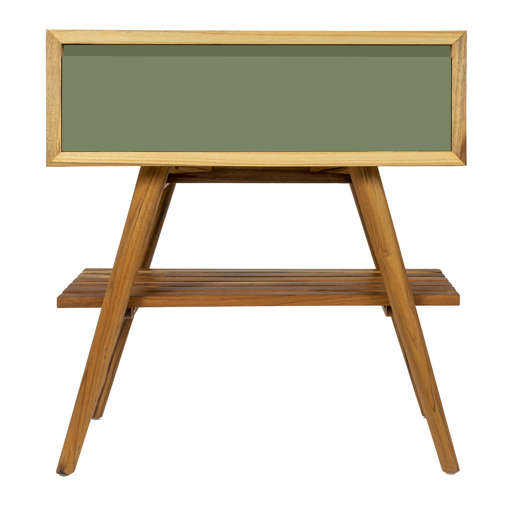 Podlahová koupelnová skříňka z přírodního recyklovaného teaku s výklopnou zásuvkou ze zeleného mahagonového dřeva , nuance spojená se vším, co připomíná přírodu, jaro a kvetení rostlin a co naznačuje plodnost, obnovu a naději. Jeho struktura se vyznačuje jednoduchými tvary a praktickými prostory ideálními pro elegantní a funkční uspořádání prostoru koupelny pro originální výsledek se silnou moderní osobností .