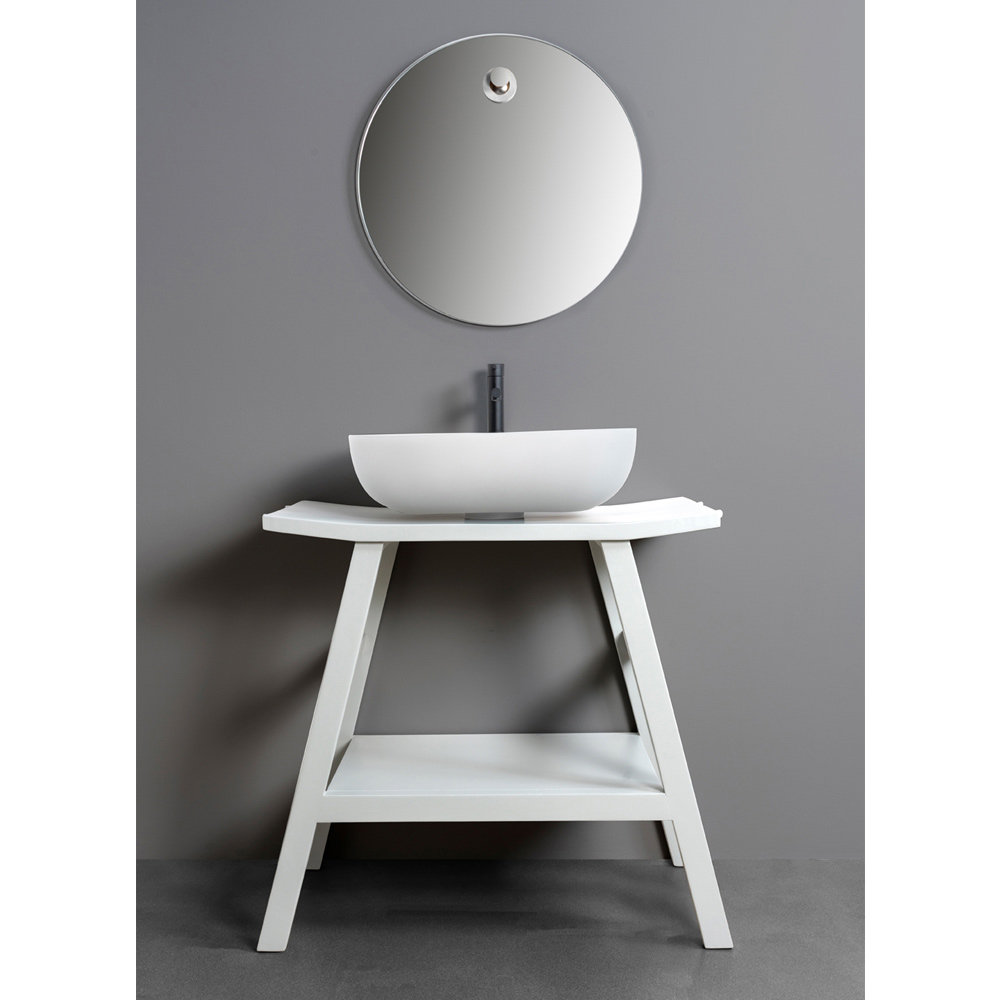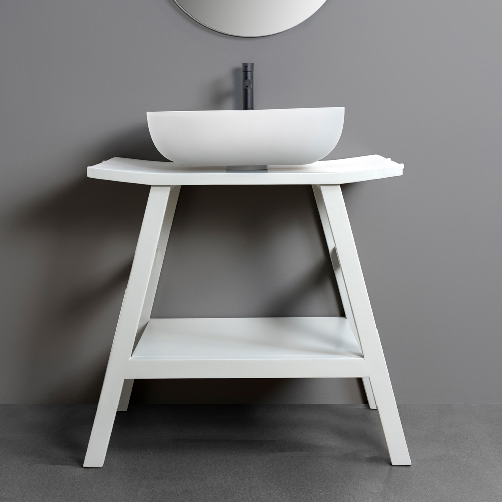 Volně stojící koupelnová skříňka vyrobená z přírodního regenerovaného teaku s matnou bílou barvou, čistý a elegantní odstín , který připomíná oslnivý odraz sněhu na slunci a dokonale ladí s teakovým dřevem pro výsledek se silnou scénografickou osobností. Jeho struktura se vyznačuje mírně zakřiveným tvarem svršku, který nabízí exkluzivní a rafinovaný dotek estetiky produktu. Kompletní se 4 praktickými háčky na ručníky a funkční odkládací policí .