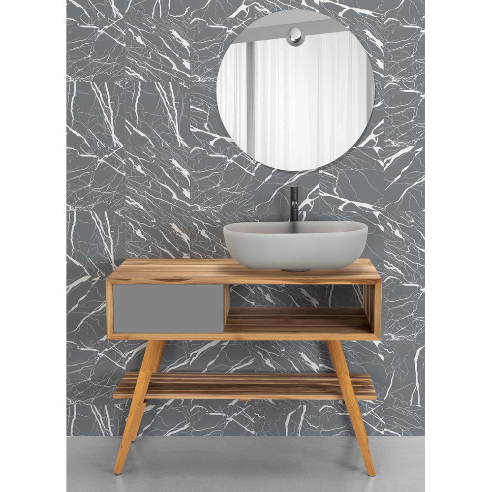 Koupelnová skříňka z recyklovaného teakového dřeva se zásuvkou z šedého mahagonu.