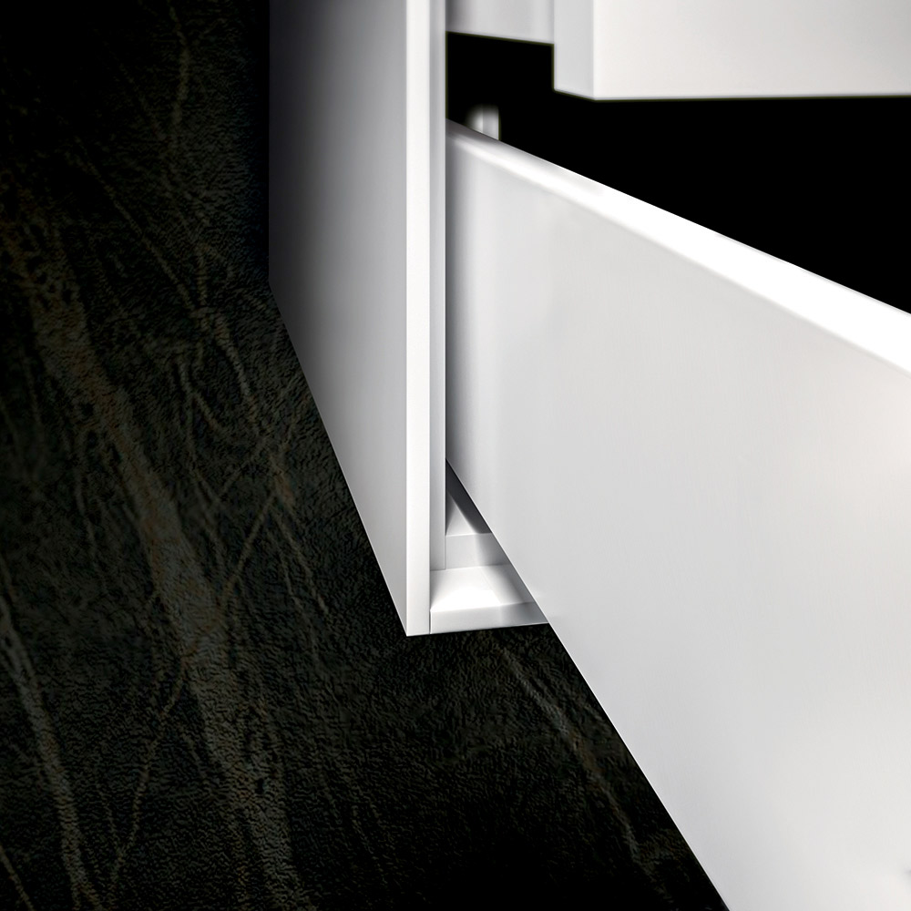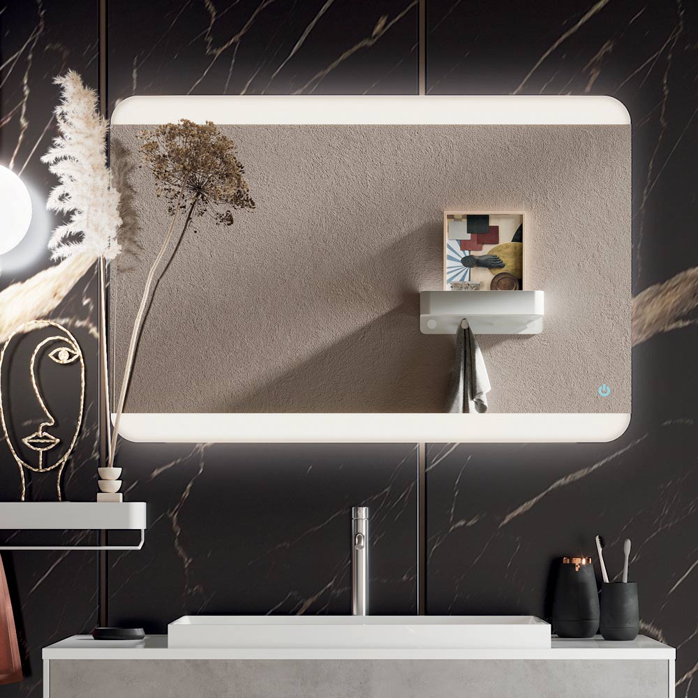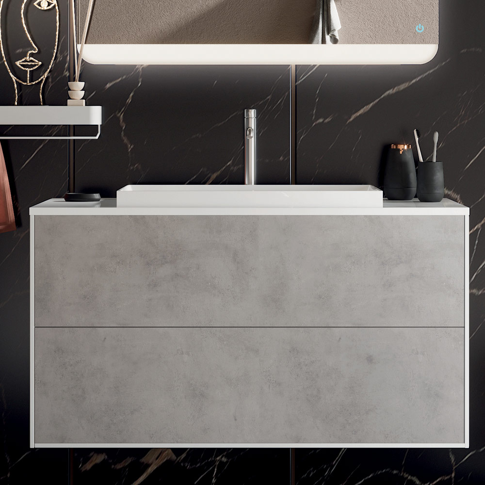 Koupelnová kompozice s vestavěným pryskyřičným umyvadlem , skleněným zrcadlem s předními a obvodovými LED diodami a melaminovou základnou v cementové barvě odolnou proti poškrábání se 2 plně vyjímatelnými zásuvkami a měkkým zavíráním.