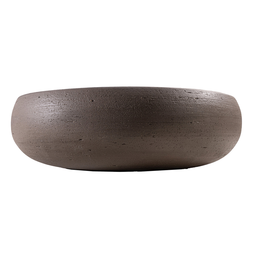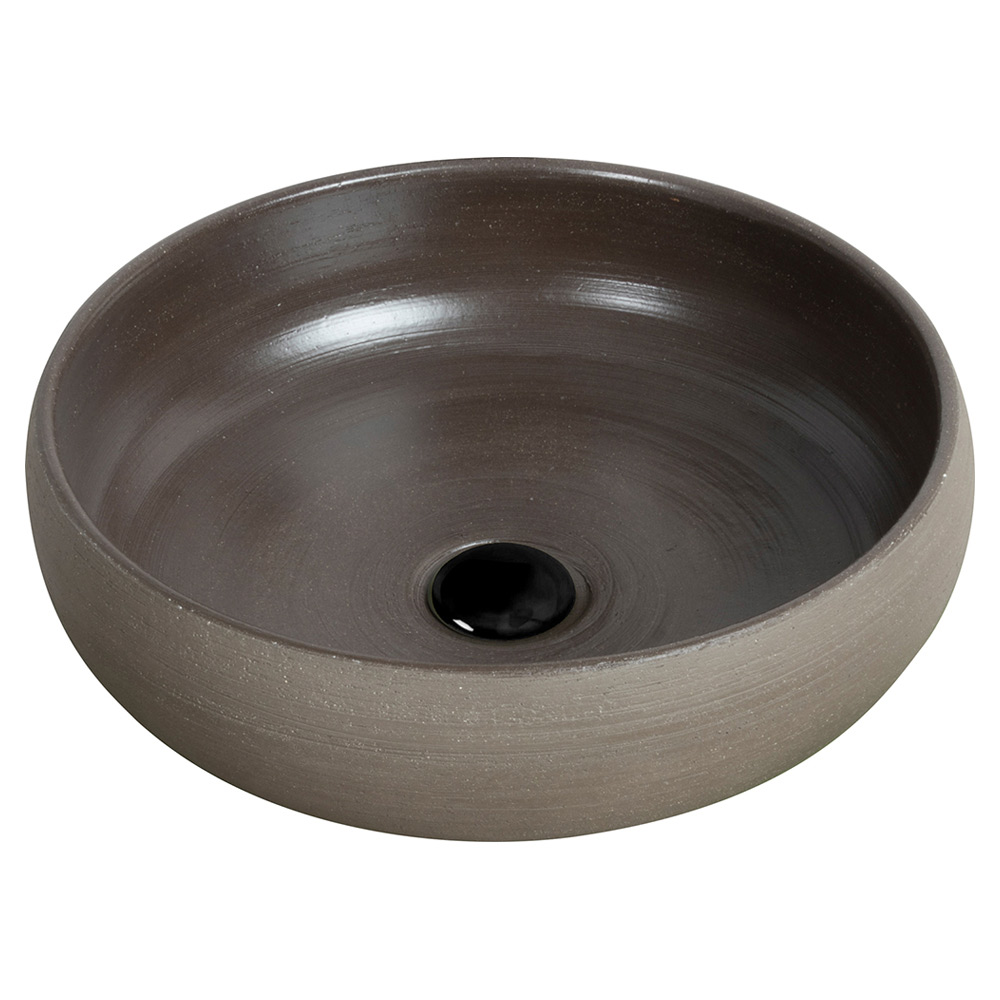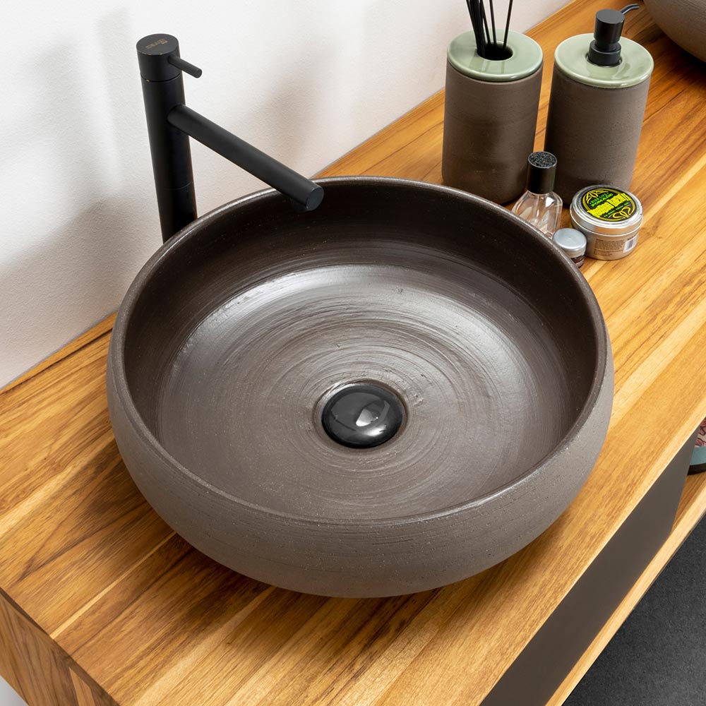 Umyvadlo na desku kulatého tvaru ze žáruvzdorné hlíny a tmavé hlíny kompletně vyrobené v Itálii, ručně soustružené a vypálené ve Third Fire. Poutavý kus nábytku na dotek a klikatý v měkkých tvarech a velkorysých rozměrech, které kombinují styl a funkčnost , takže je ideální pro umístění do jakékoli koupelny. Rustikální a elegantní povrch zvýrazňuje světelný charakter tohoto dřezu, což z něj činí hlavní postavu a osvětluje atmosféru.