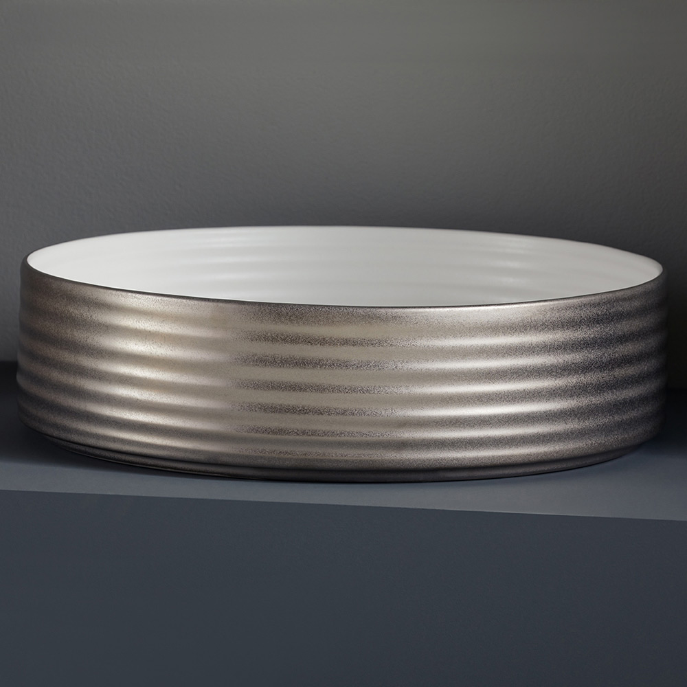 tekutá měkkost tvarovaná člověkem, kde zvlněné plochy zachycují světlo a tvarují materiál. Toto umyvadlo se tak stává