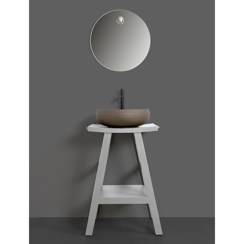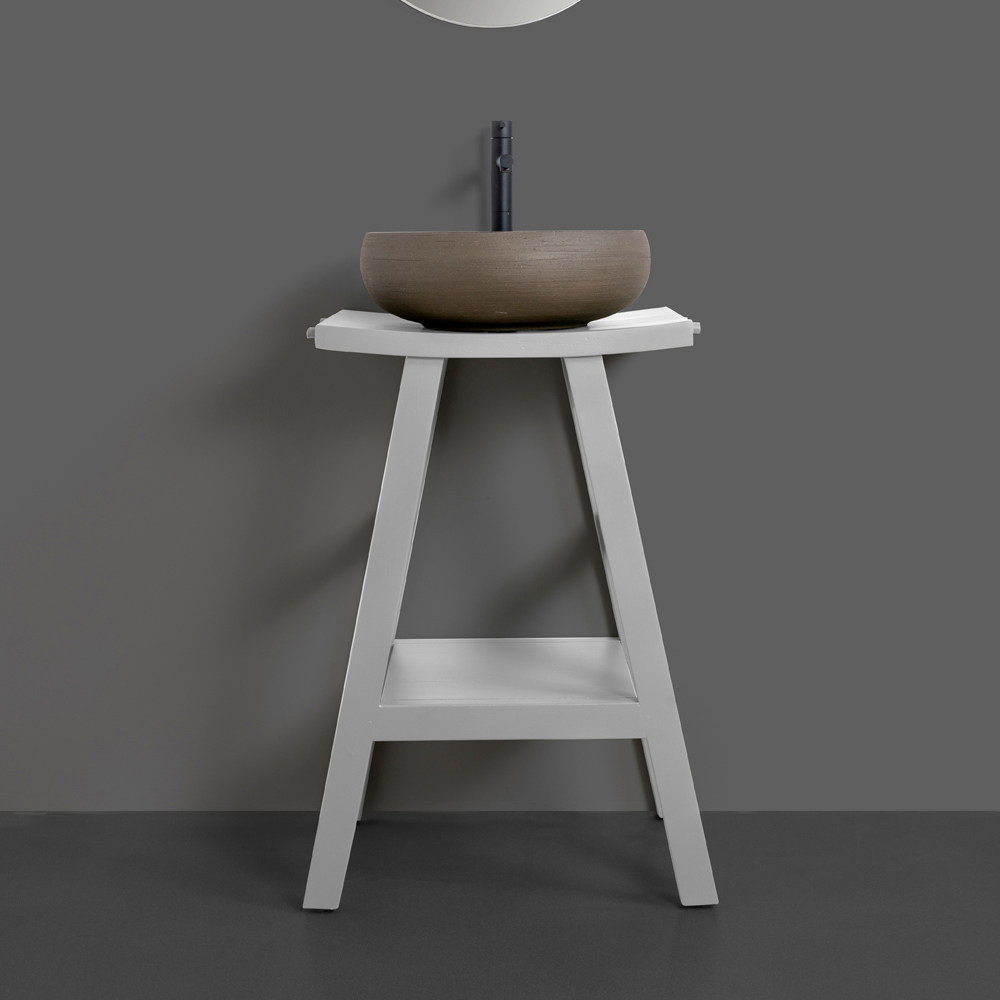 Volně stojící koupelnová skříňka z přírodního recyklovaného, matně šedě lakovaného teaku , nadčasové barevné nuance, která hovoří mezinárodním jazykem elegance, je dokonalá v jakémkoli prostředí a nenápadně na sebe upozorní. Jeho struktura se vyznačuje mírně zakřiveným tvarem svršku, který nabízí exkluzivní a rafinovaný dotek estetiky produktu. Kompletní se 4 praktickými háčky na ručníky a funkční odkládací policí .