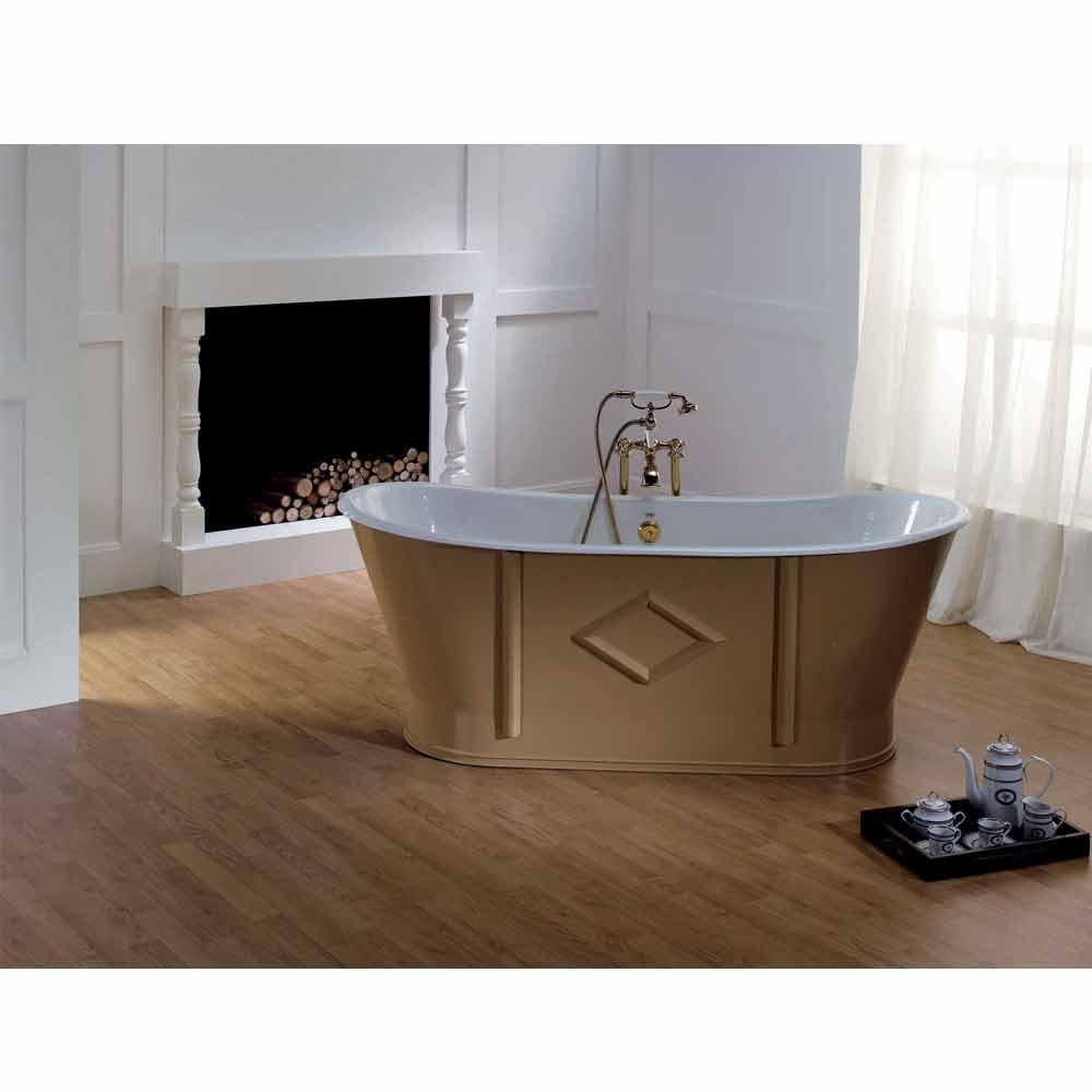Volně stojící vana celá z litiny spočívající na zemi, s bočním zdobením. Vnitřní 2 mm titanový smaltovaný povrch a vnější lakovaný povrch v různých barvách. Vana, která představuje vrchol luxusu!