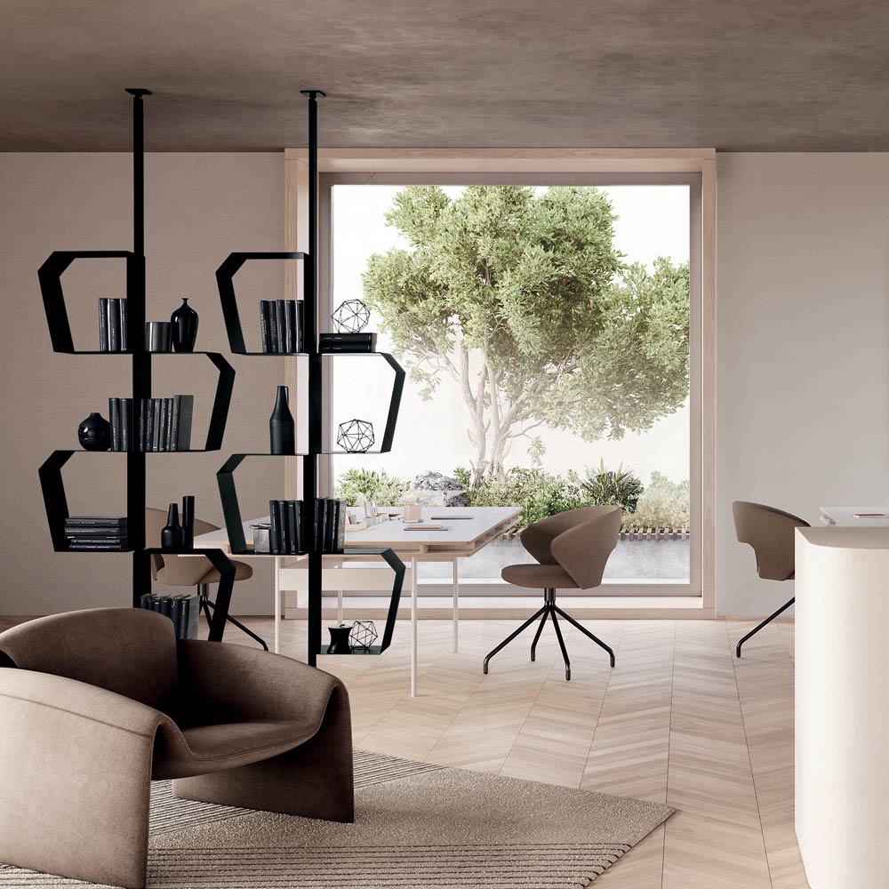 Díky své všestranné konfiguraci lze knihovnu instalovat pomocí nástěnných nebo stropních úchytů . Ve stropní verzi ji lze také použít jako dělicí prvek , ideální pro oddělení prostorů a zároveň zachování vizuální lehkosti.
