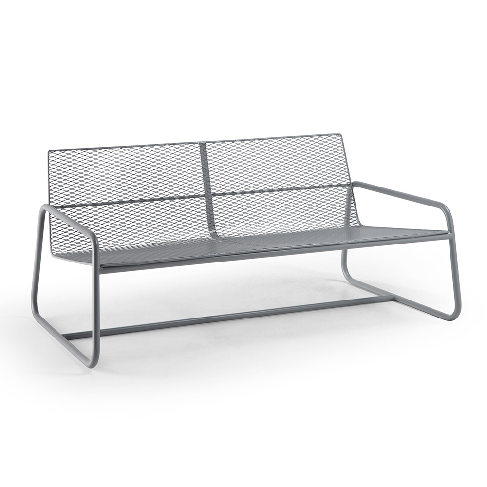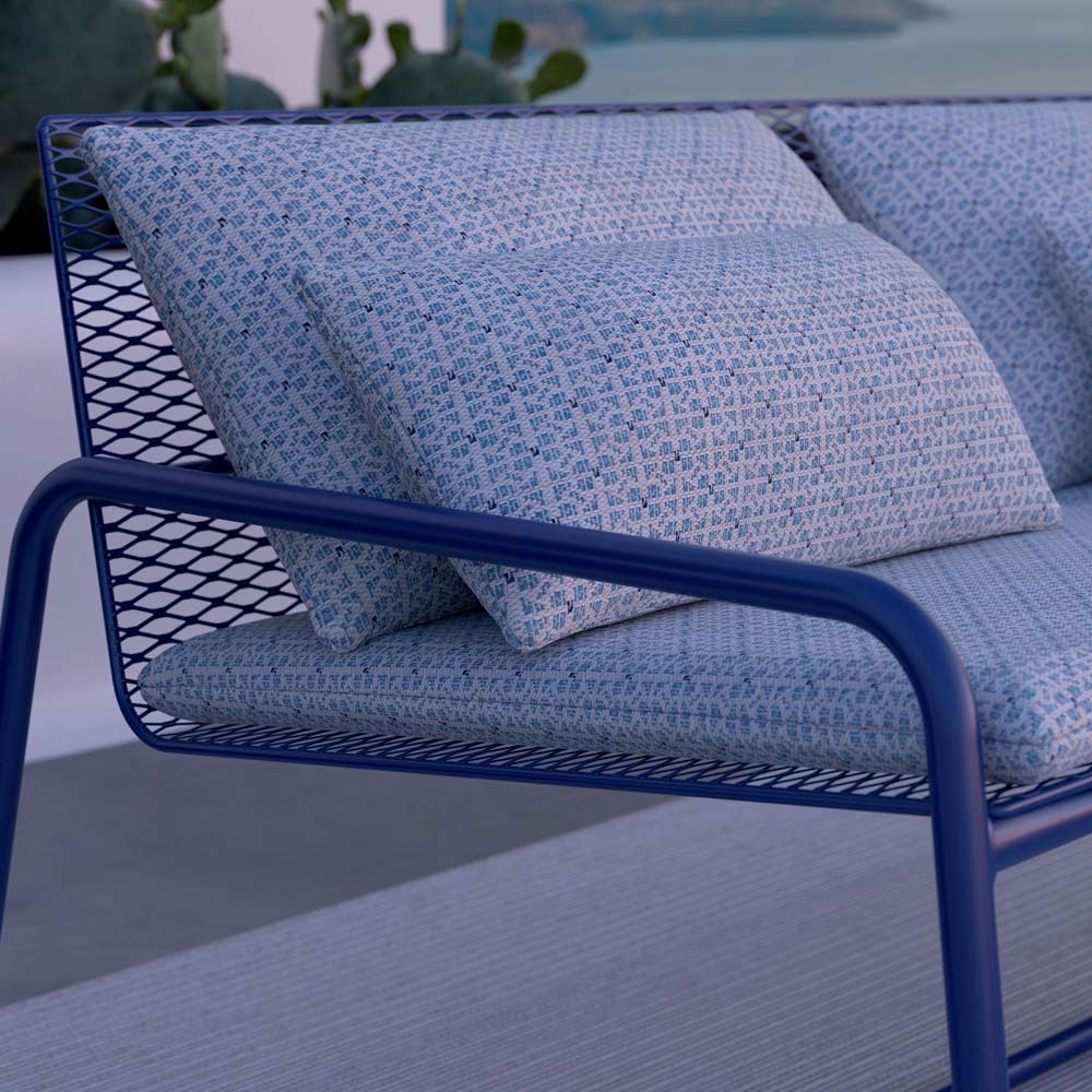 Venkovní kovová pohovka s koordinovanými látkovými polštáři v různých povrchových úpravách, luxusní zboží vyrobené v Itálii.