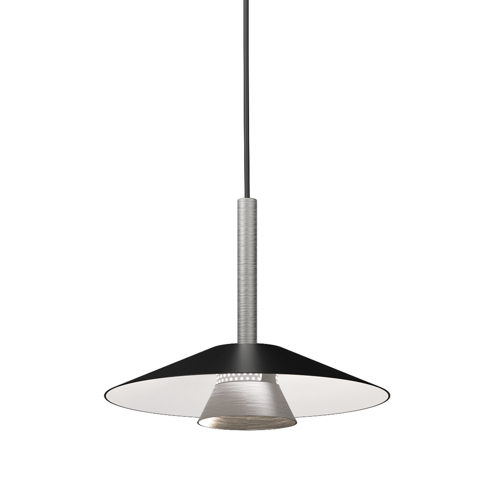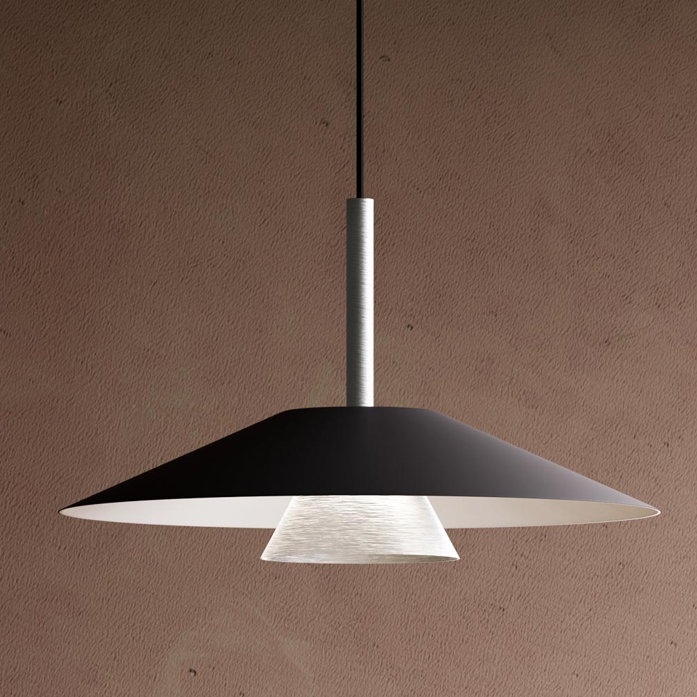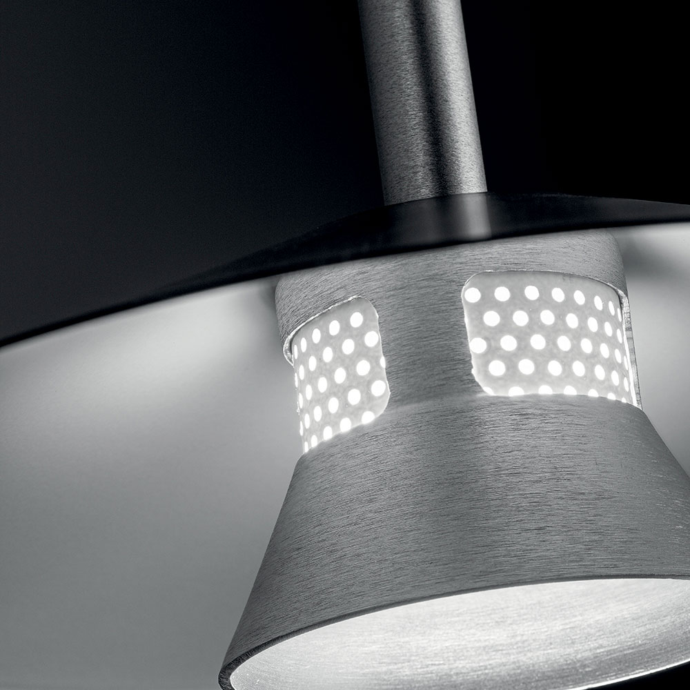 Tato lampa je dokonalým spojením moderního designu a industriální elegance a je určena pro ty, kteří milují rafinované detaily a výraznou estetiku. Geometrická struktura s kuželovým difuzorem a velkým reflexním diskem vytváří fascinující hru objemů a kontrastů a zajišťuje směrové a obklopující světlo.